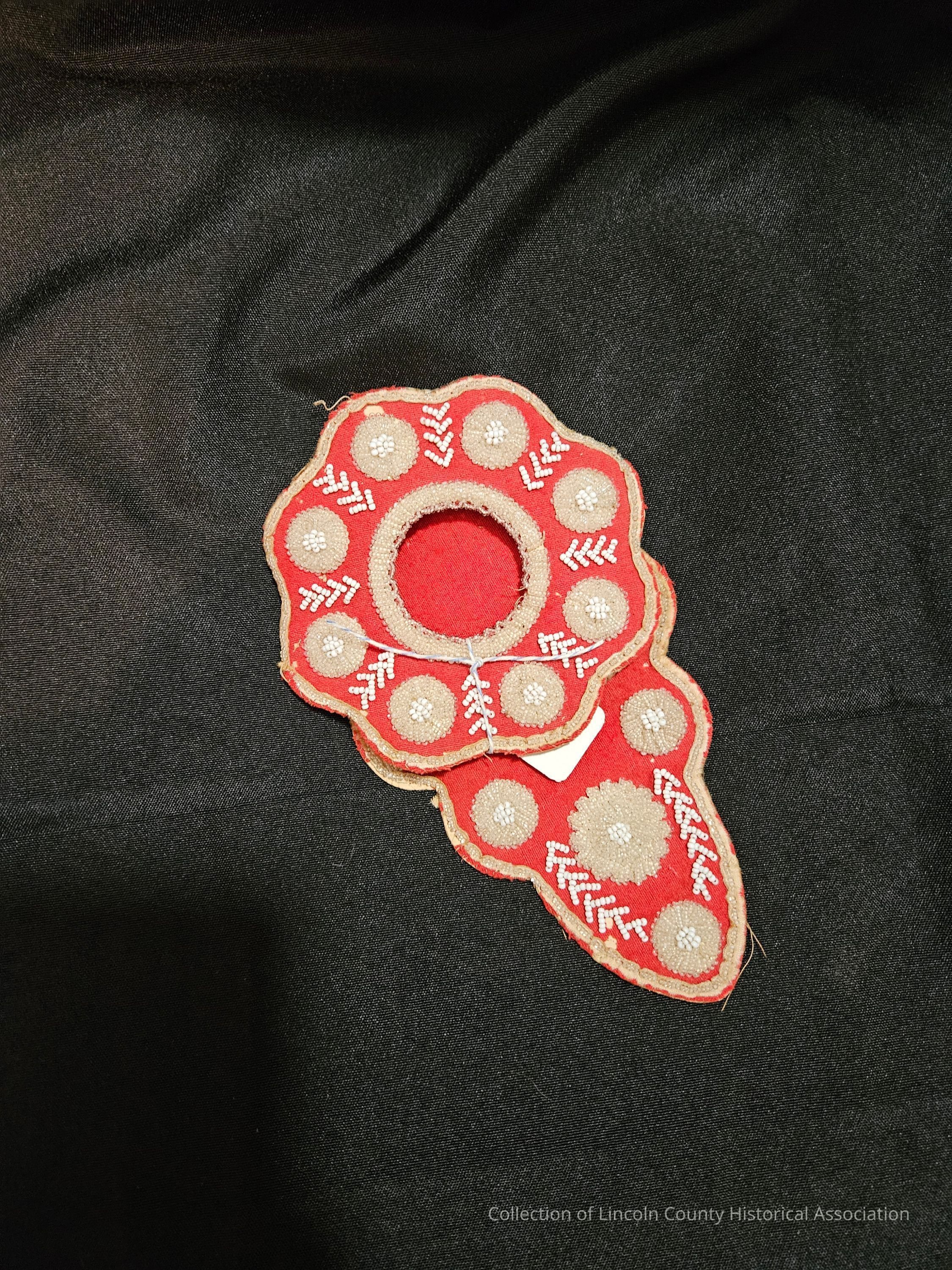 Red Native American watch guard/photograph holder. Leather with red fabric on top. Circular and triangular beadwork designs.Made/Created