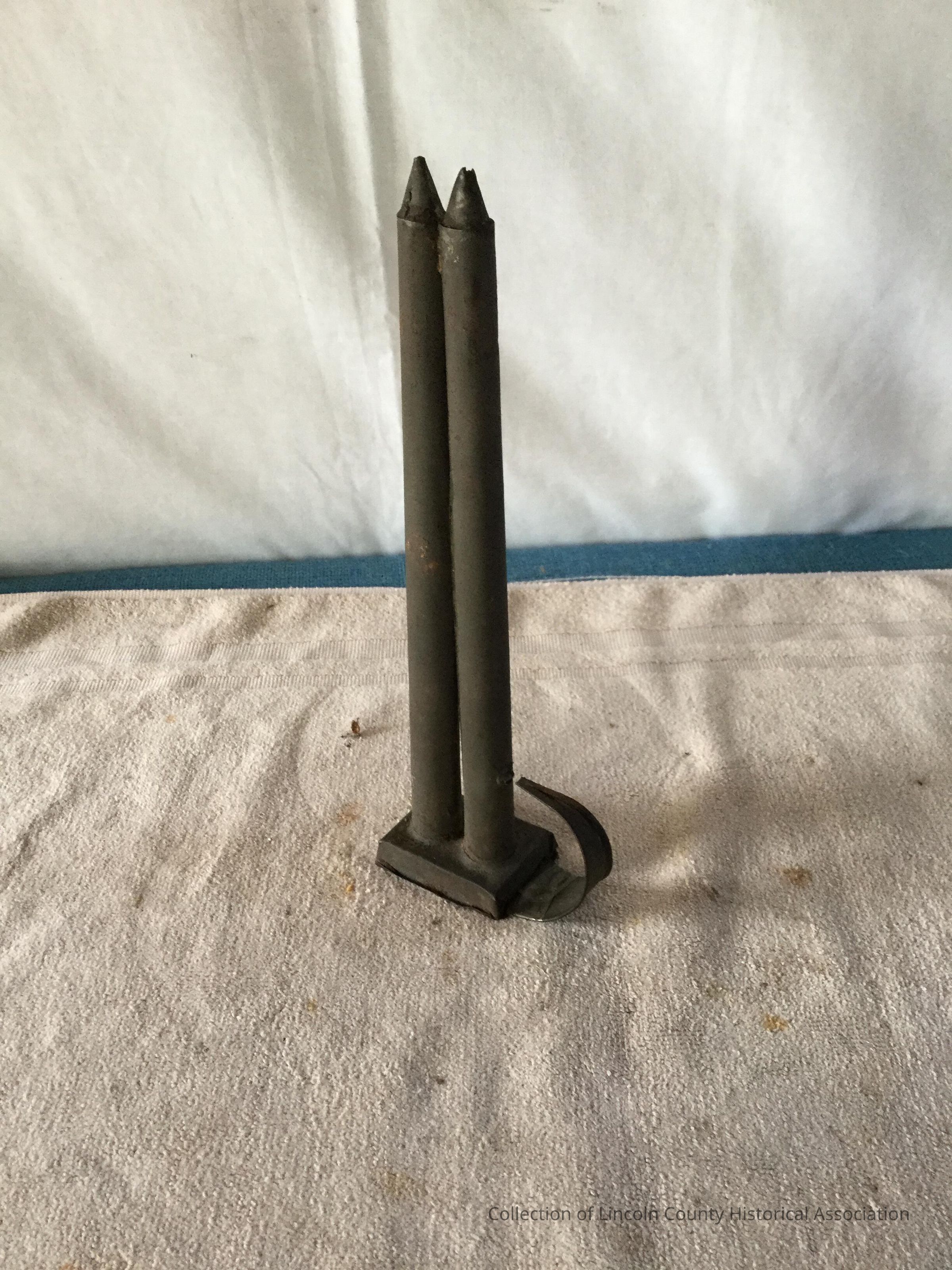 Tin candle mould for two candles with attached scroll handleMade/Created