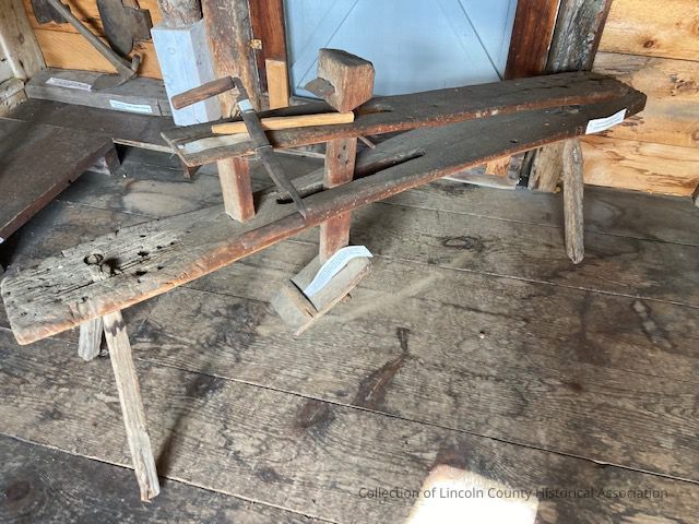 Wooden shaving horse (also known as a shingle maker's bench). Wooden plank supported by four wooden legs (one is missing) and with a built-in clamp block attached to a wooden foot pedal. Through this mechanism the user could hold the wood to be cut into shingles by the use of a draw knife. The clamp block was guided within a groove in the upper plank of woodMade/Created