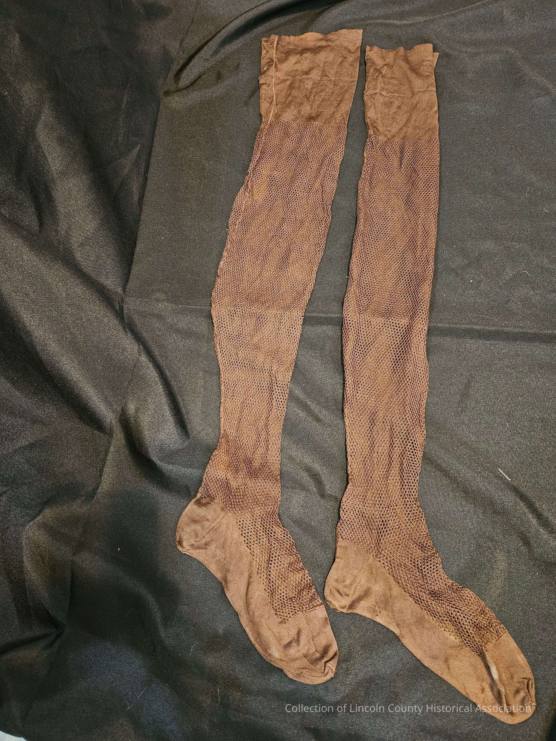 Brown women's silk mesh knit stockings. Tops of stockings and bottom of feet of a thin silk material. Knee length.Clothing/Dress/Costume Details