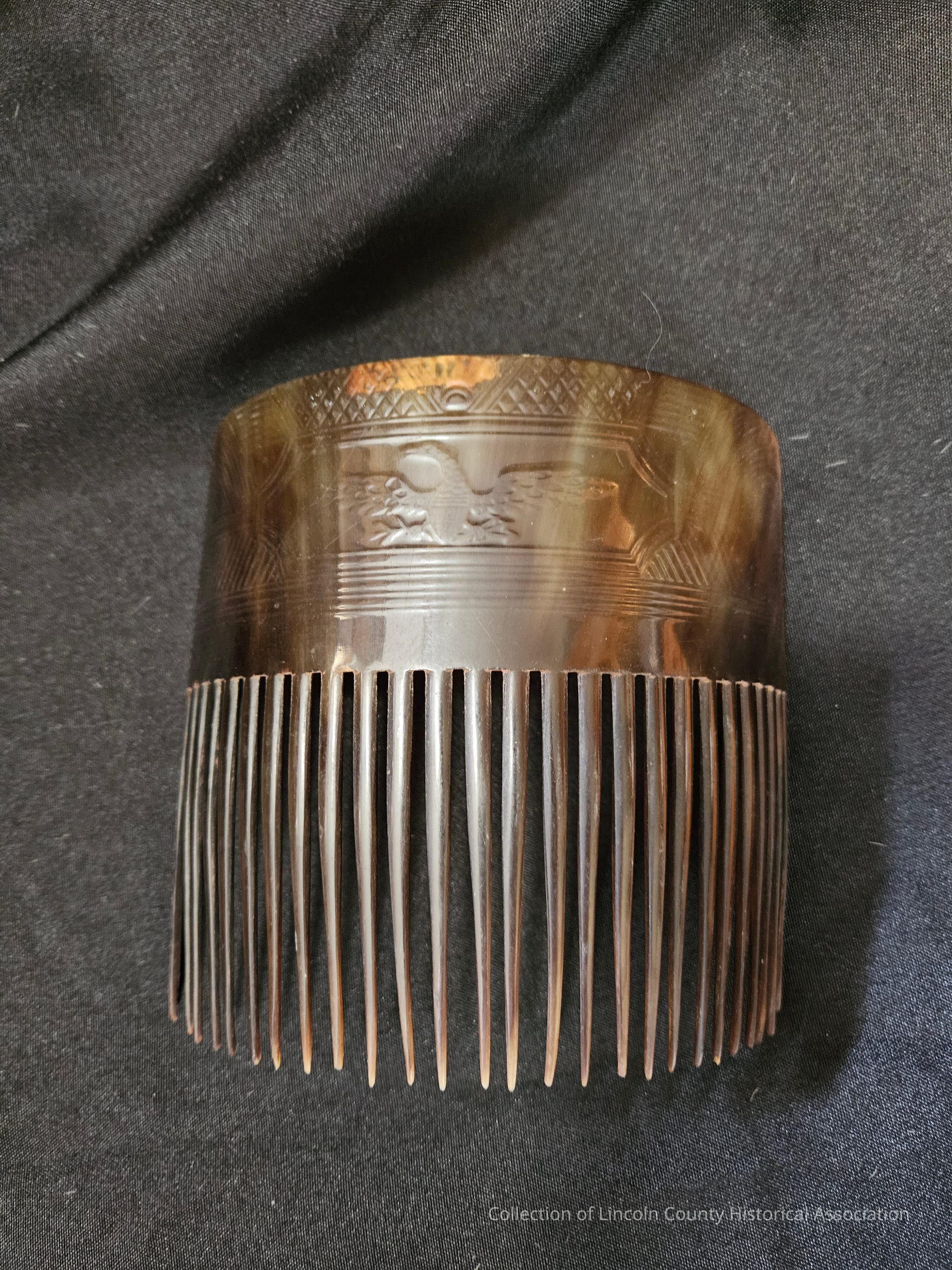 Half round ornamental fake tortoiseshell comb. Stamped with an eagle design. 27 extant teeth, one original tooth missing.Made/Created