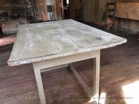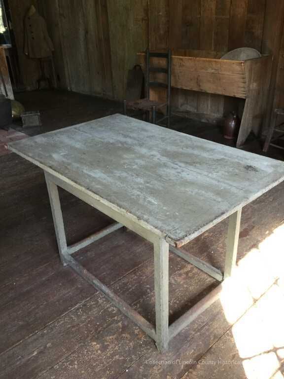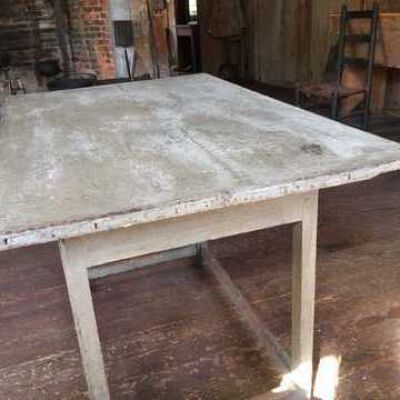 Painted gray, rectangular table, with plain squared legs and stretchers. Table has mortise and tenon joining. One end of top has bread board endMade/Created