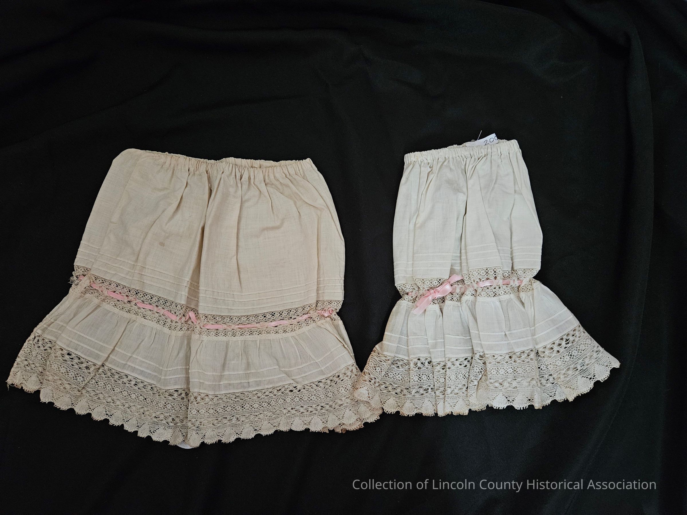 White cotton sleeves/cuffs with lace edges and lace inset. Pink ribbon around middle of sleeves. Pleated above inset and edge. Elastic around top.Clothing/Dress/Costume Details