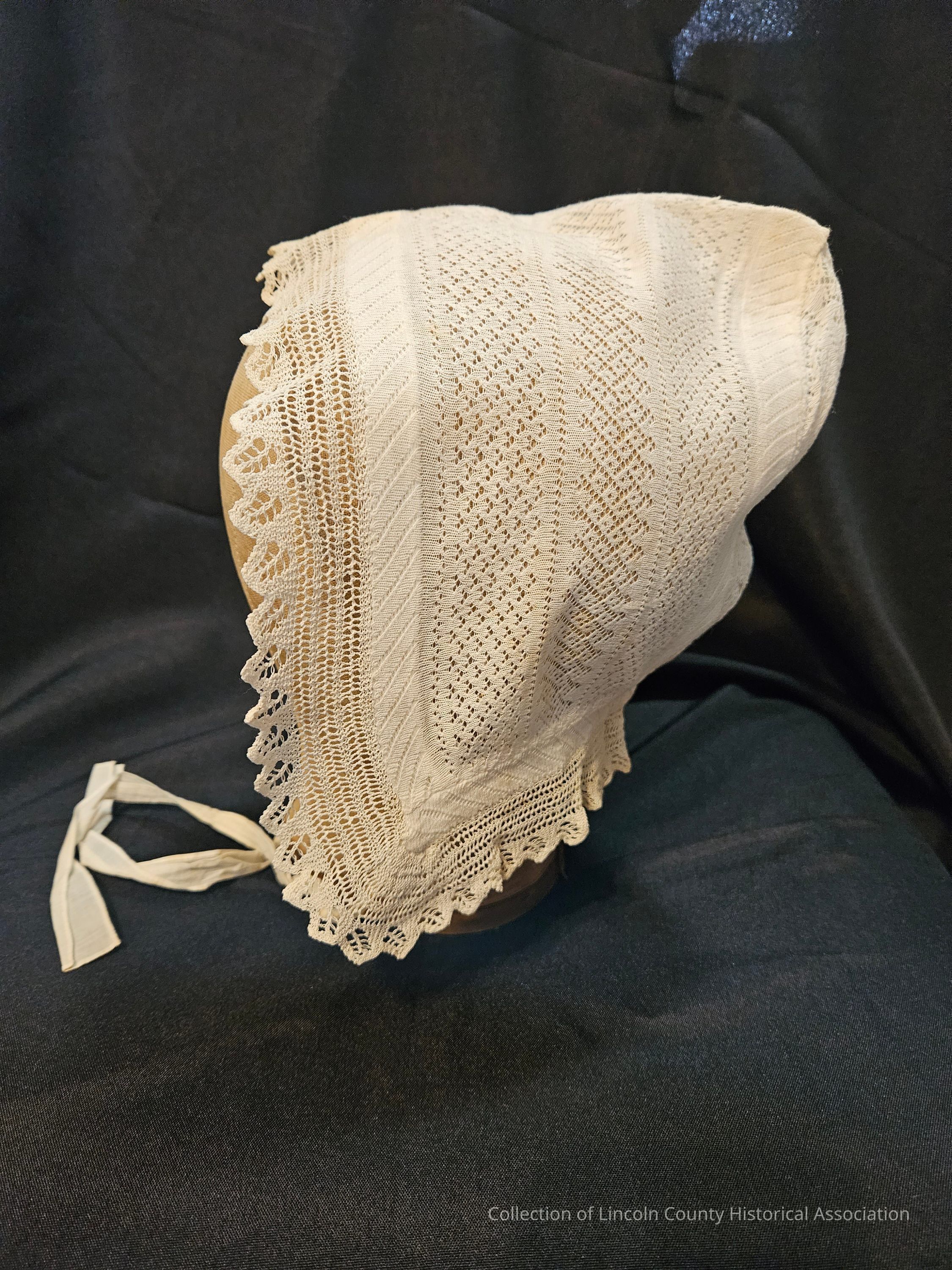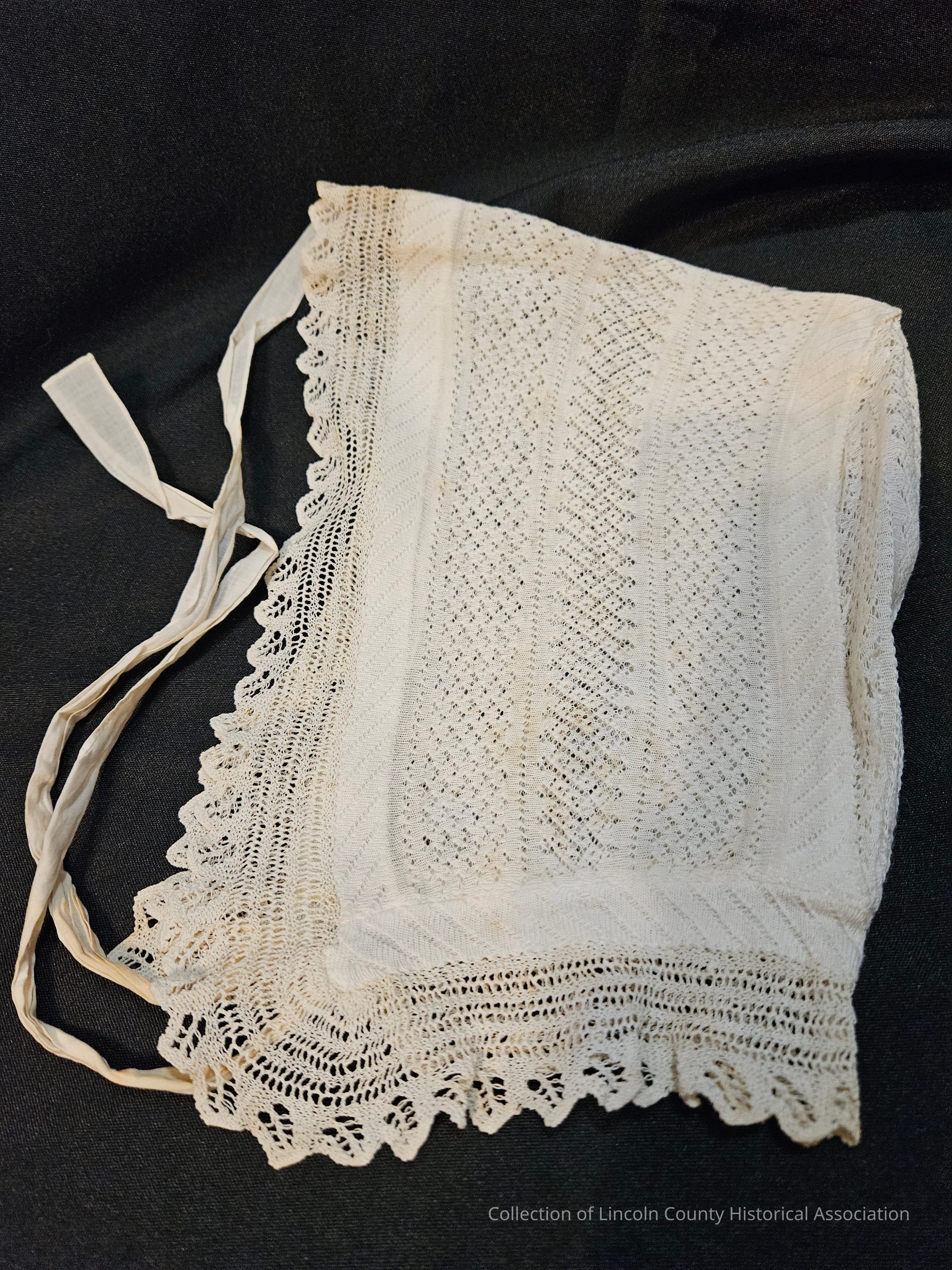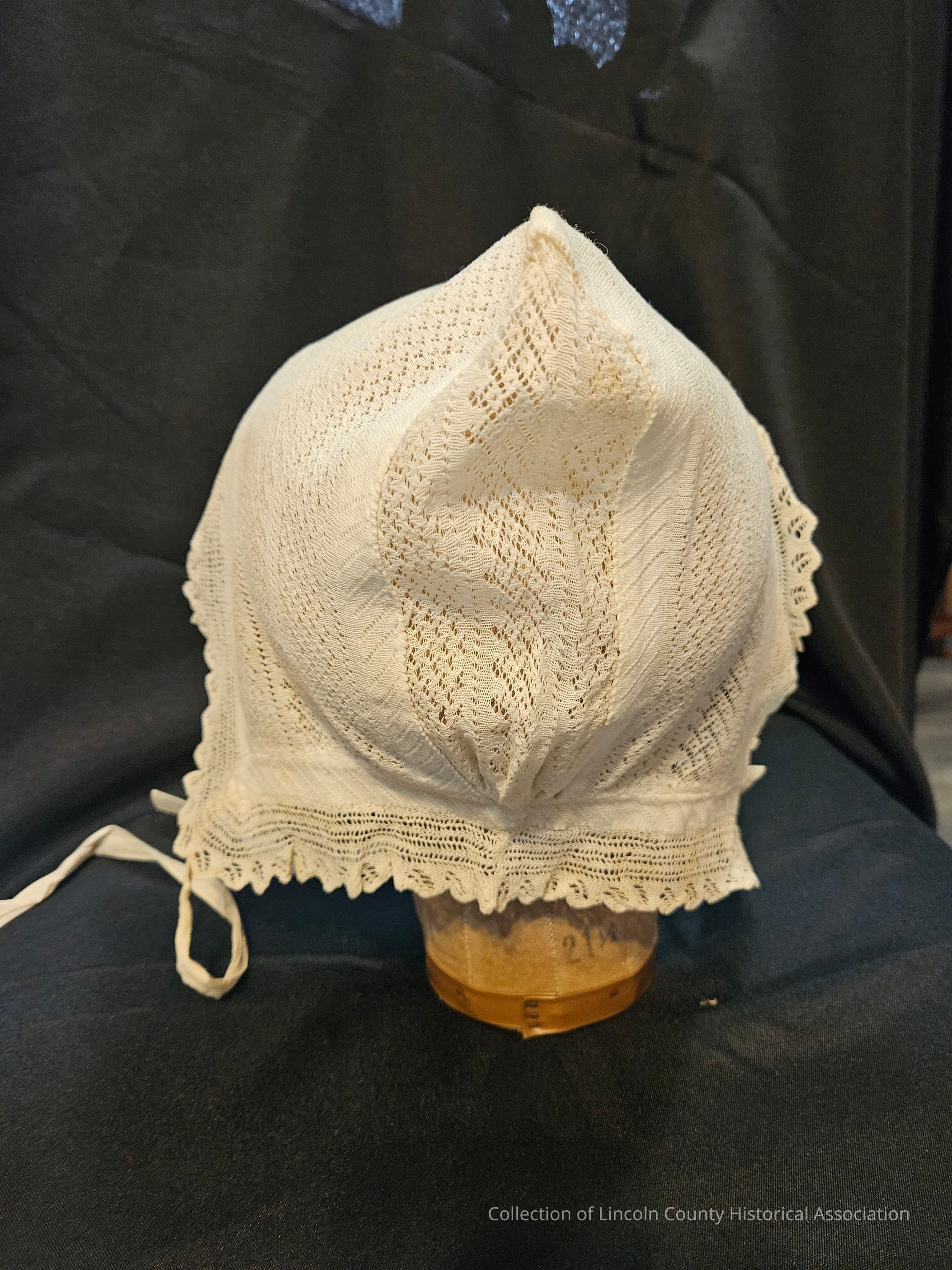 Open weave patterned cotton woman's cap with a crochet lace edge. Cap edge has a leaf pattern and the rest of the cap has line, diamond, and arrow patterns.Clothing/Dress/Costume Details