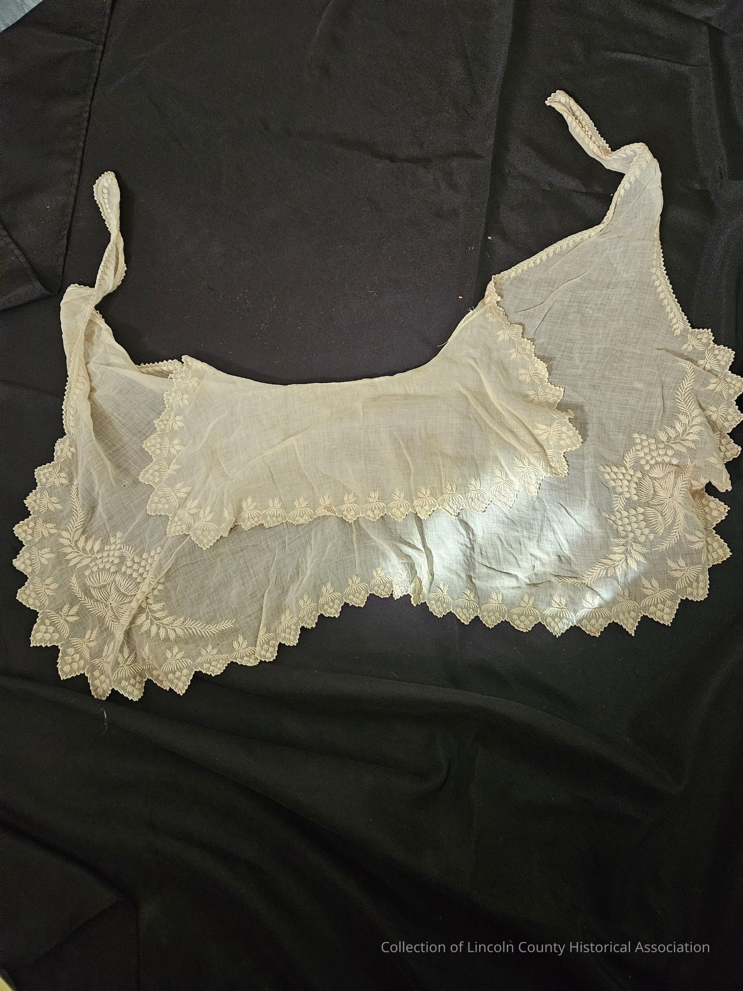Large cotton gauze collar. Leaf designs around triangular edges. Top center section is folded over bottom half.Clothing/Dress/Costume Details