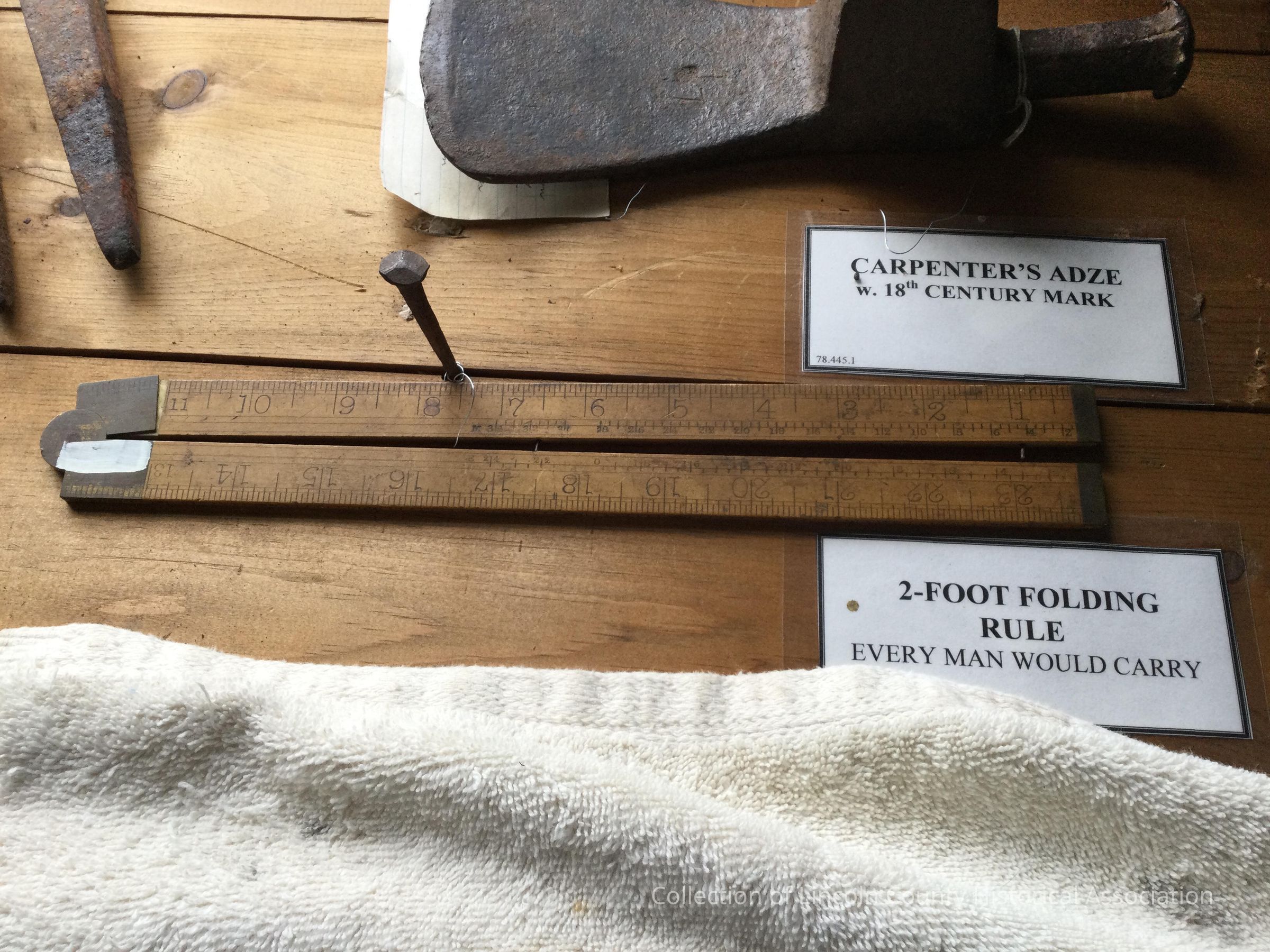 Two foot folding ruler with two twelve inch wooden shafts held together by a brass hinge. Wooden measuring arms have metal caps and one has a brass metal runner.Made/Created