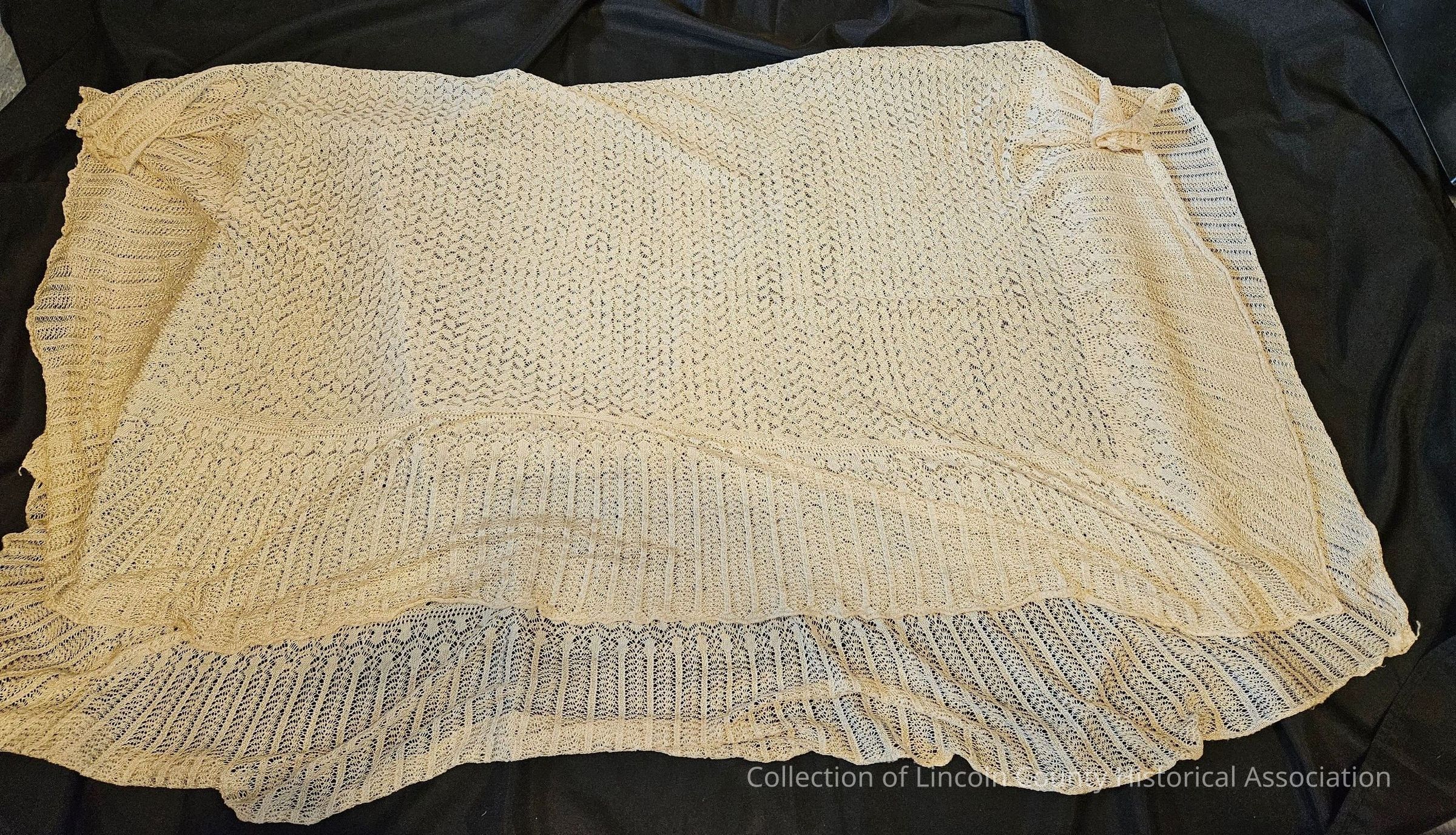 White cotton christening shawl. Leaf and geometric design. Machine made. Rectangular in shape.Clothing/Dress/Costume Details