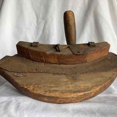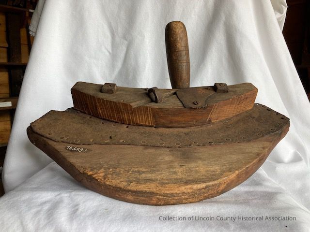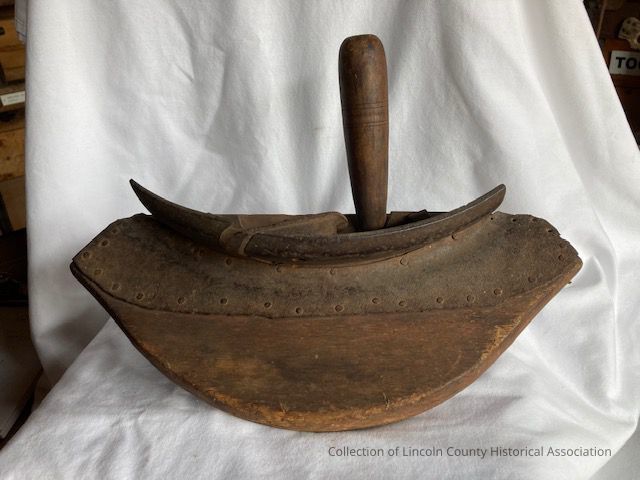 Oak wood and metal howell with turned wooden handle. Has iron wear plates on base and a cast iron frame for its steel blade. This howell also has a scorer on its back side. Object is also referred to as a "Cooper's In-shave"