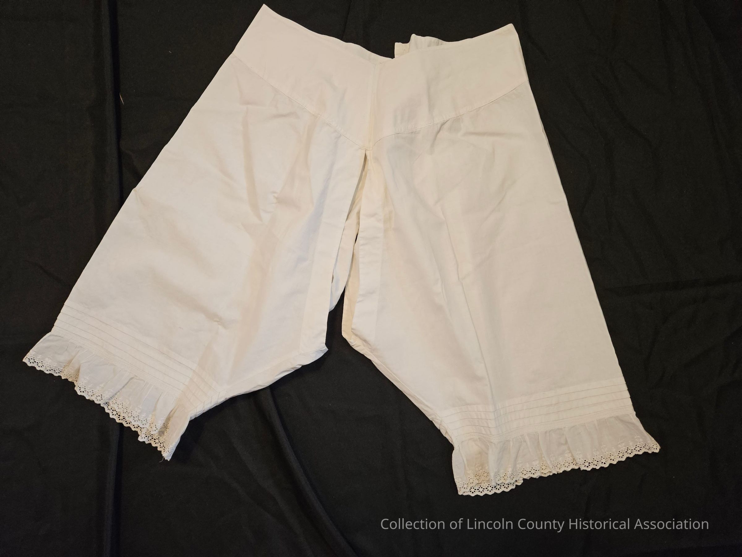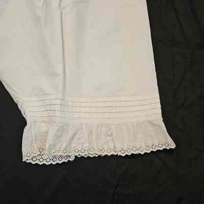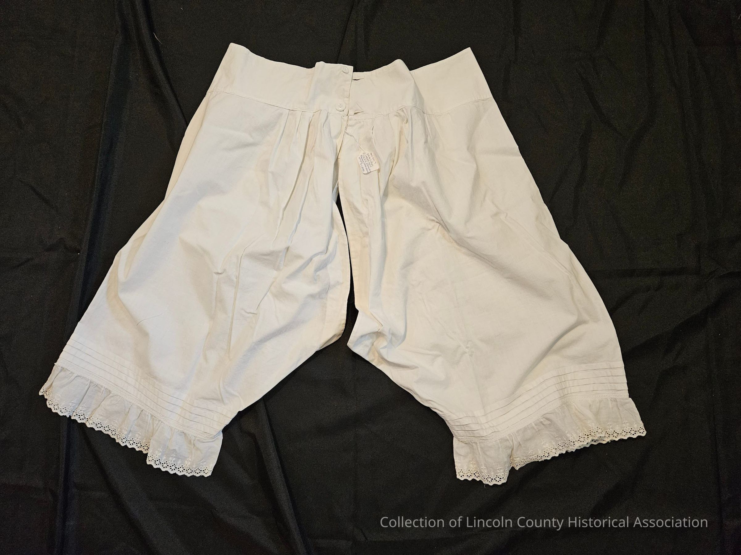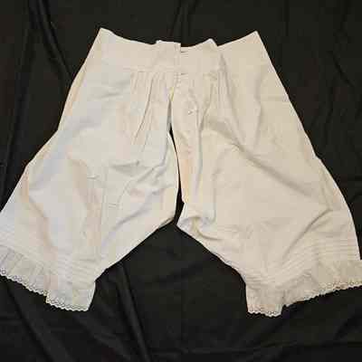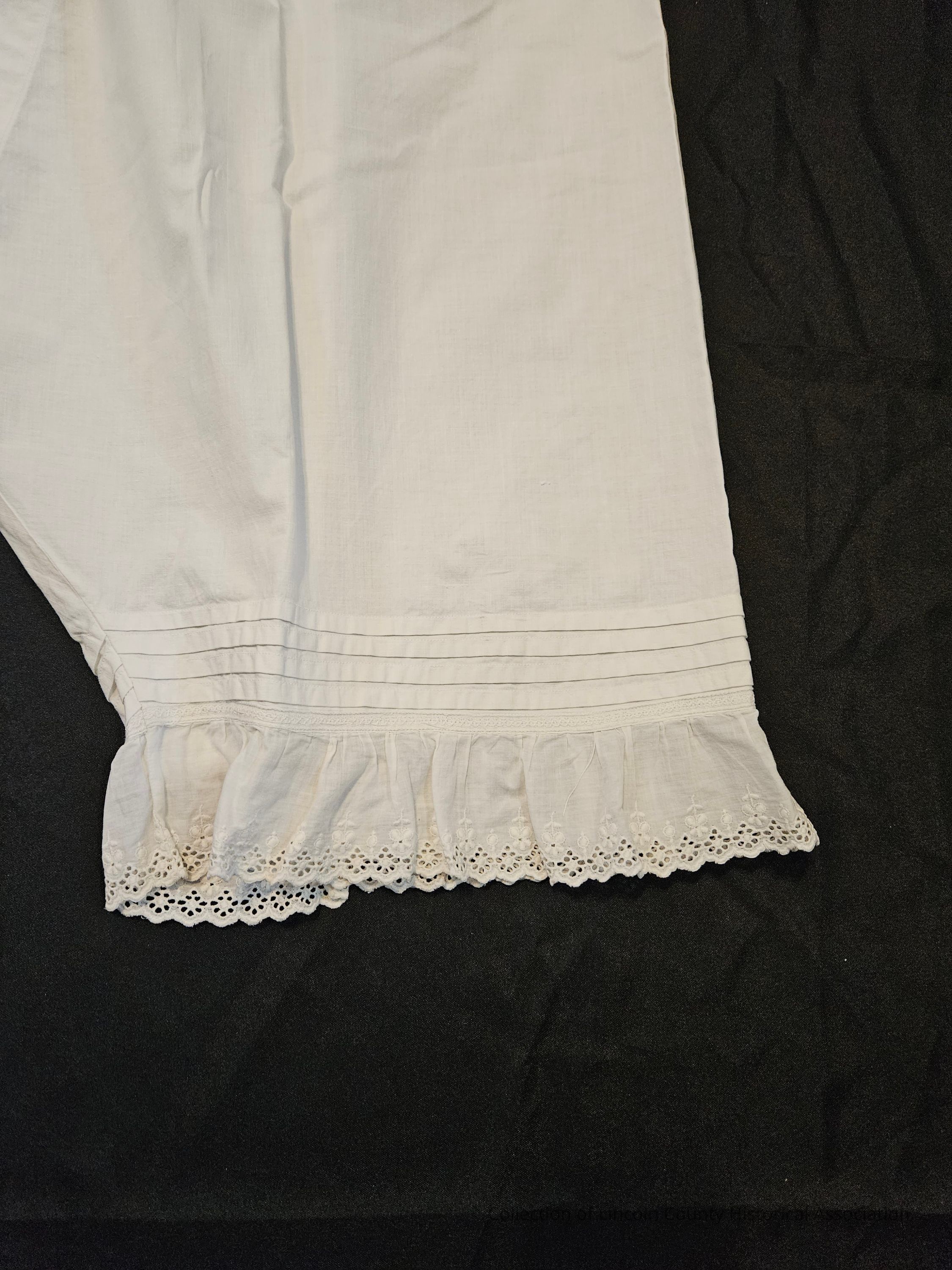 Women's white cotton underwear/drawers. Split crotch. Machine stitched. Pleats and machine made embroidery at base of pant legs. Embroidery is a floral design. Two buttons at back of waist.Clothing/Dress/Costume Details