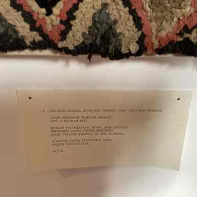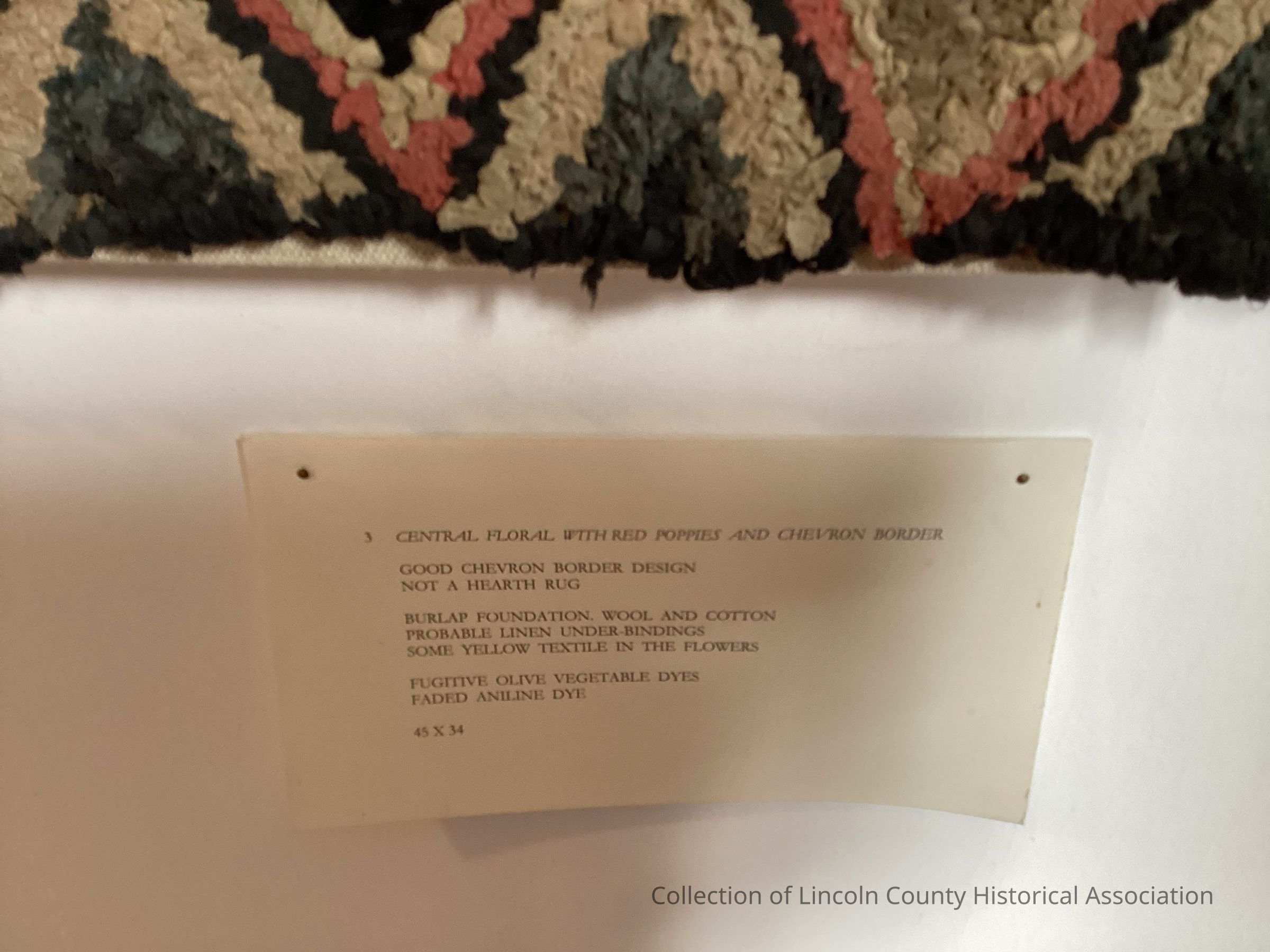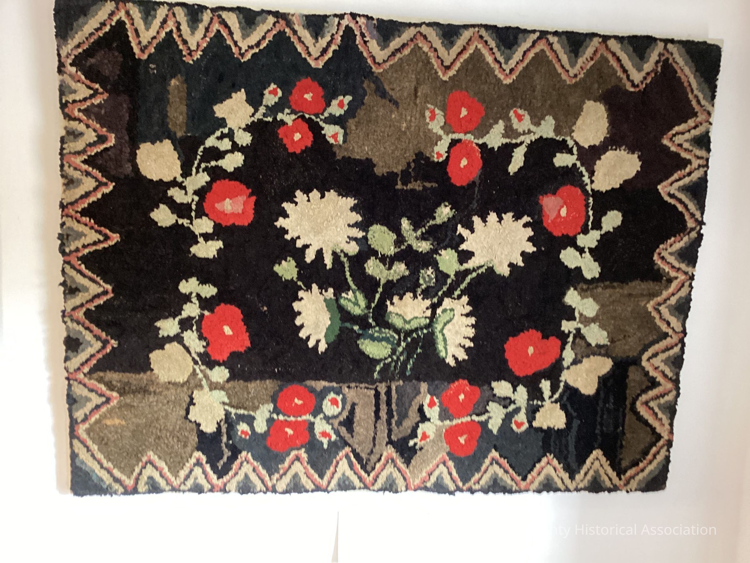Hooked rug. White and red chevron border. Poppies in circle pattern surrounding center white flowers. Burlap foundation, wool and cotton yarn. Aniline and vegetable dye.Made/Created