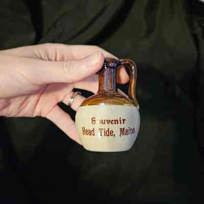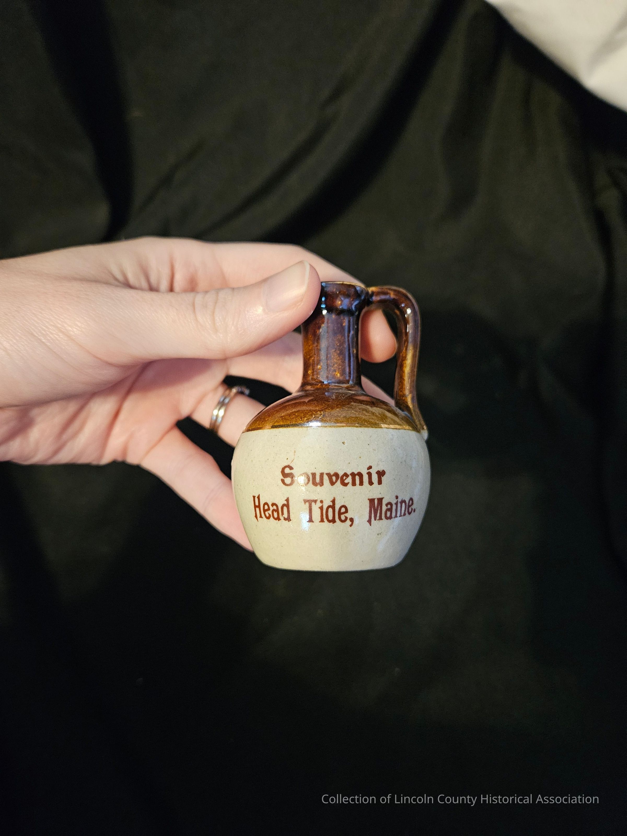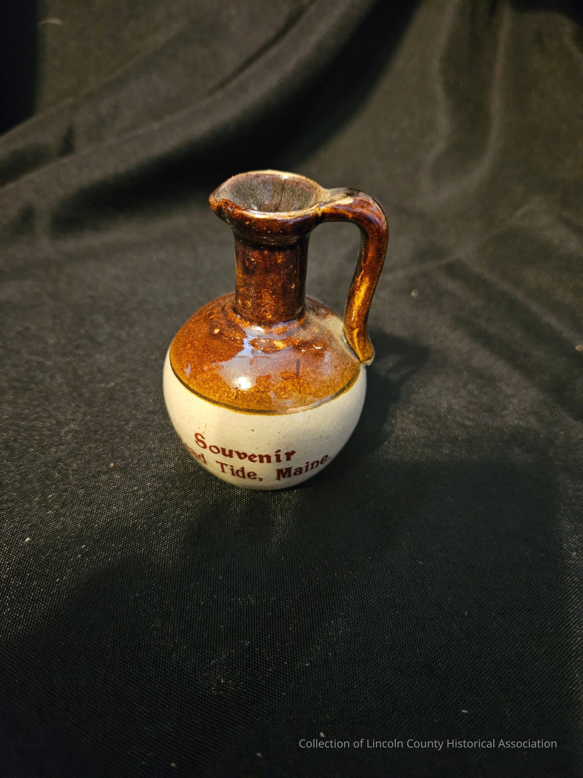 China souvenir pitcher. Gray and brown. Souvenir of Head Tide.
