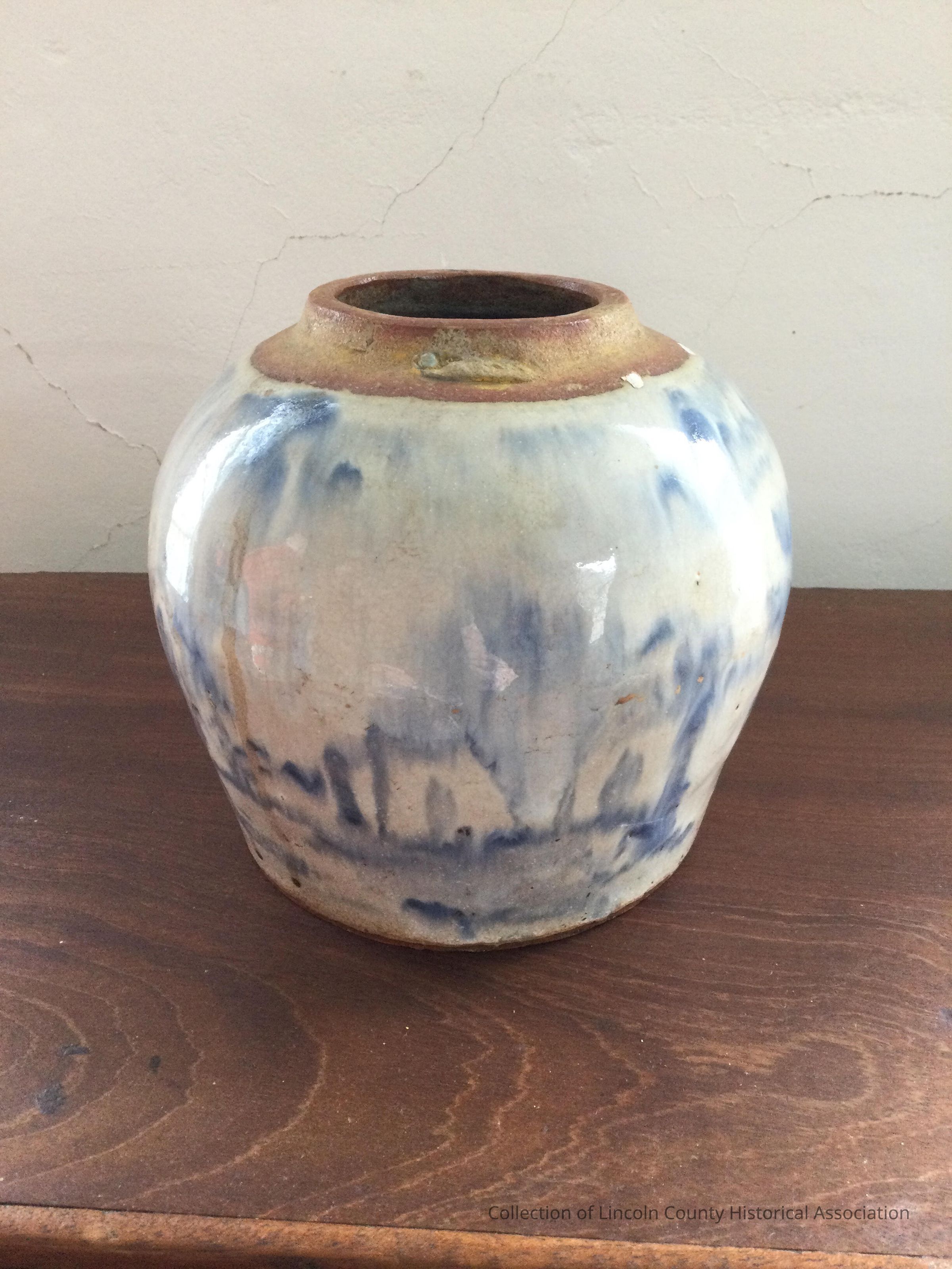 Chinese iron stone ginger jar missing its top. Light bluish gray background with darker blue clouds and ropesMade/Created