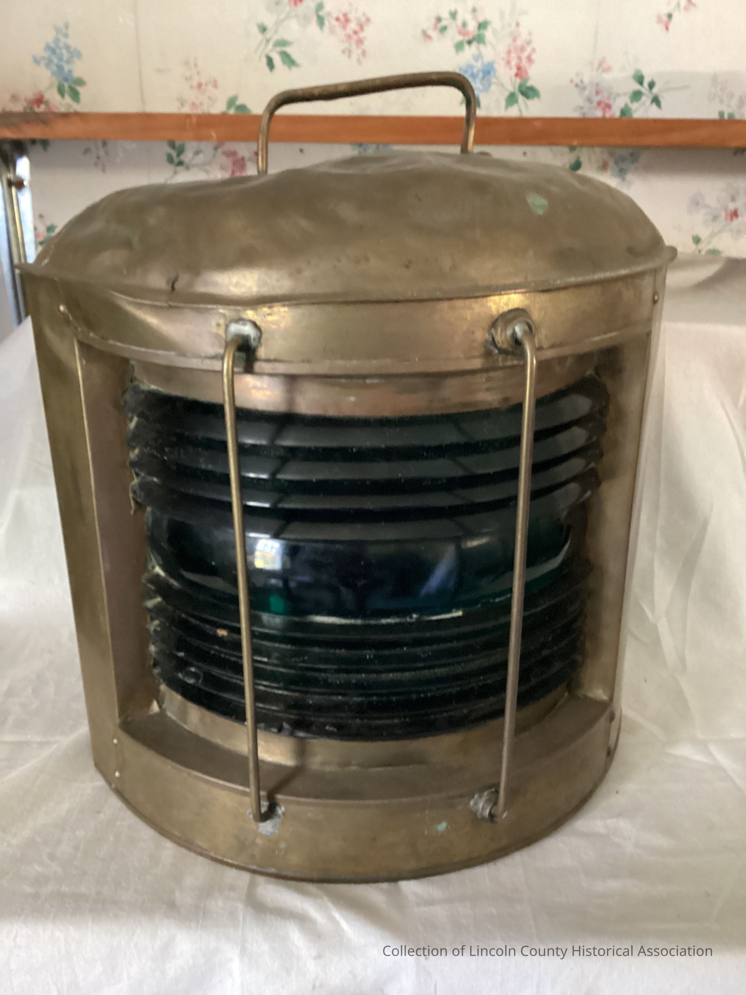With glass and green glass lens. Probably illuminated with kerosene. The metal top is pretty dented from use.
