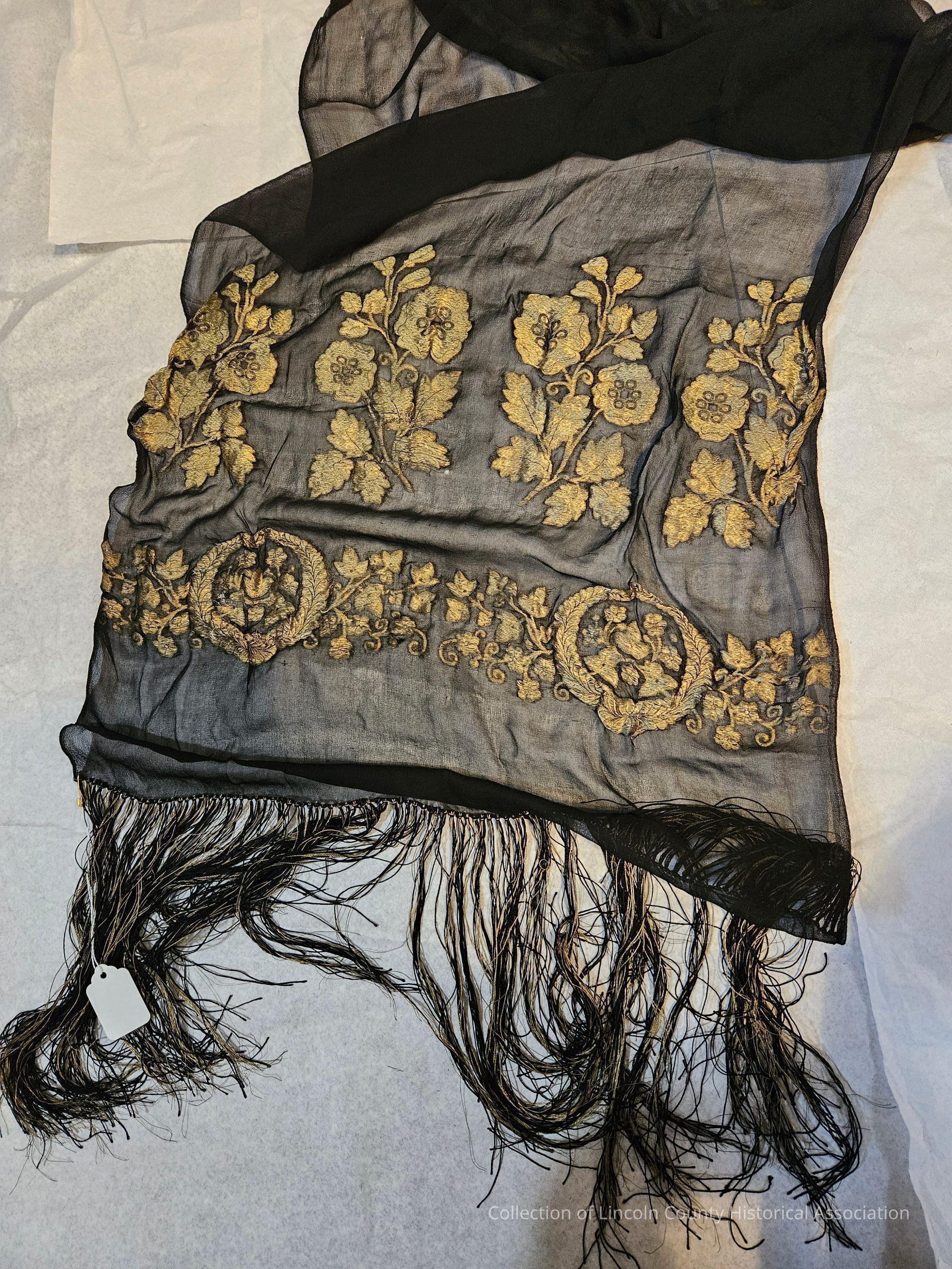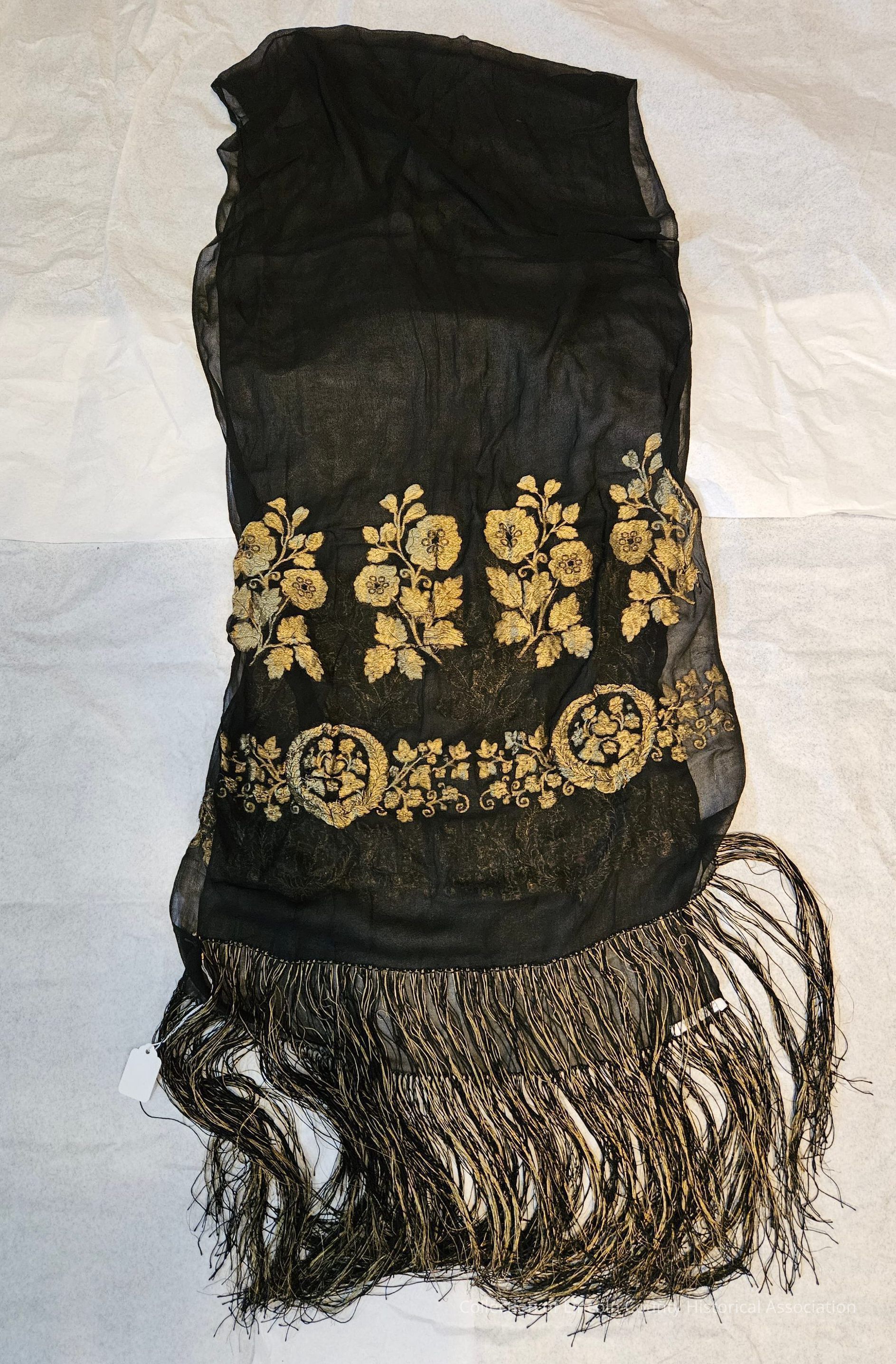 Sheer black silk rectangular shawl. Gold floral applique on each end of shawl. Black and gold fringe on each end.Clothing/Dress/Costume Details