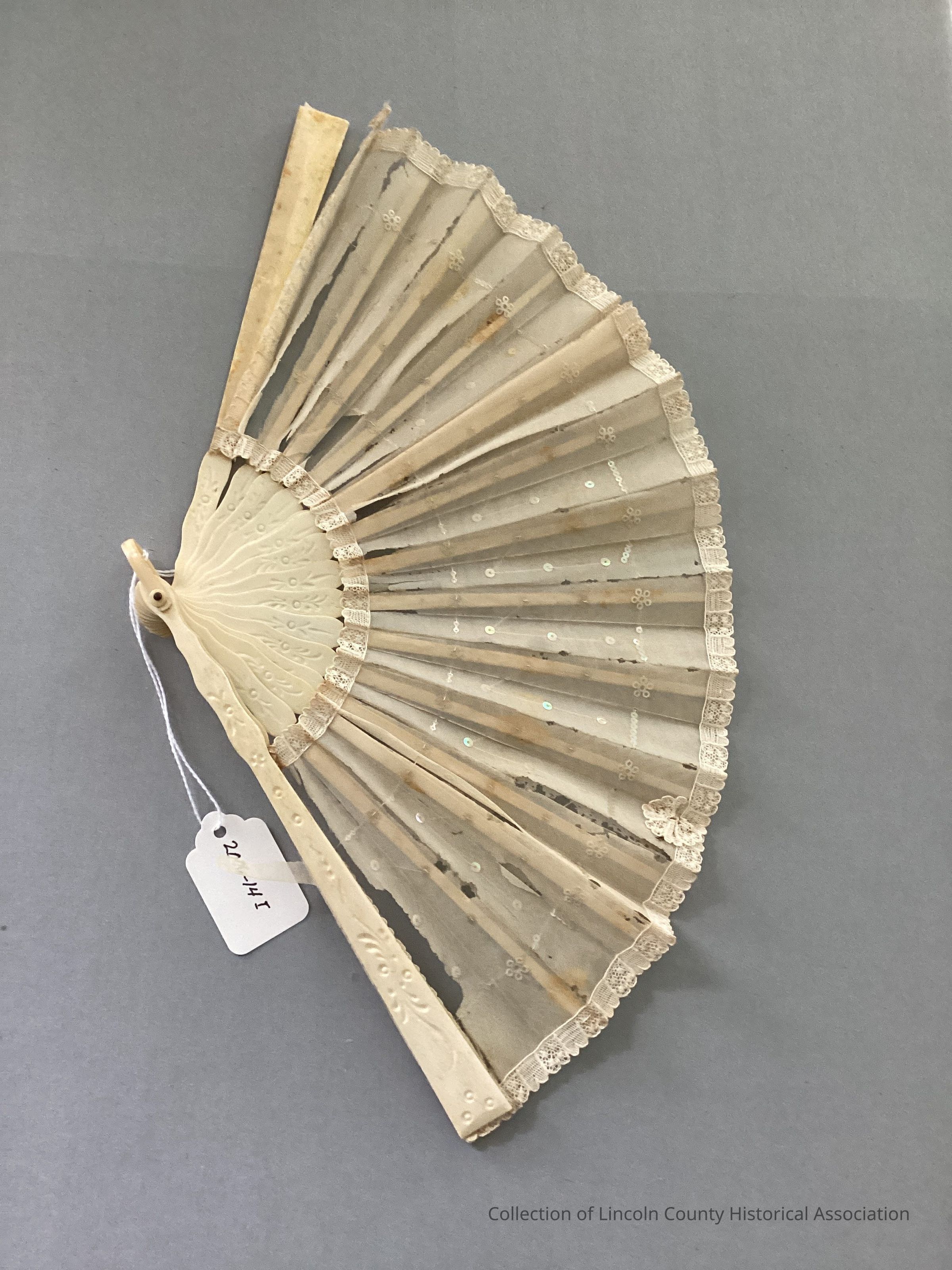Fan with carved ivory sticks. Silk netting with sequins and lace edging at top of the sticks.