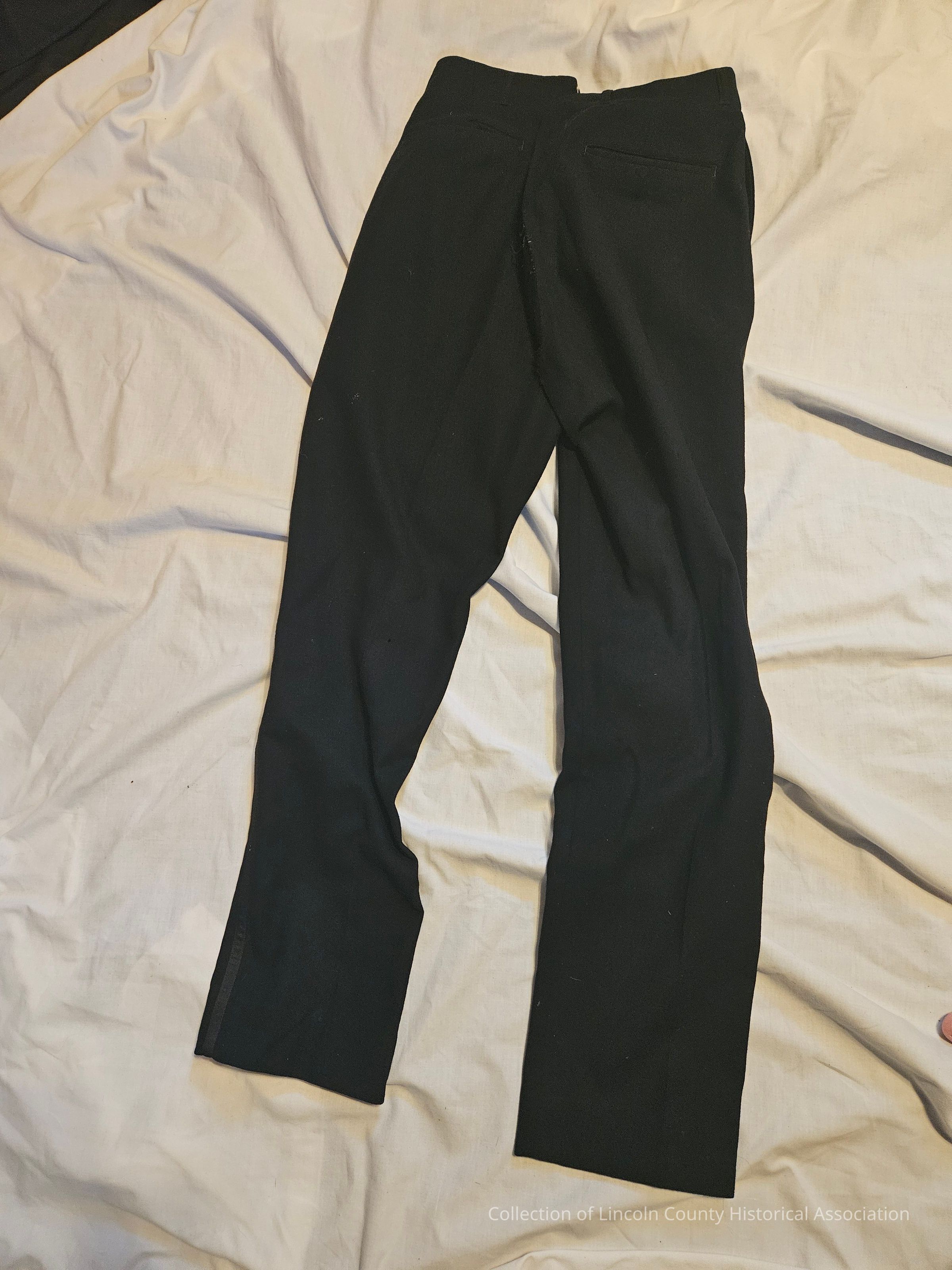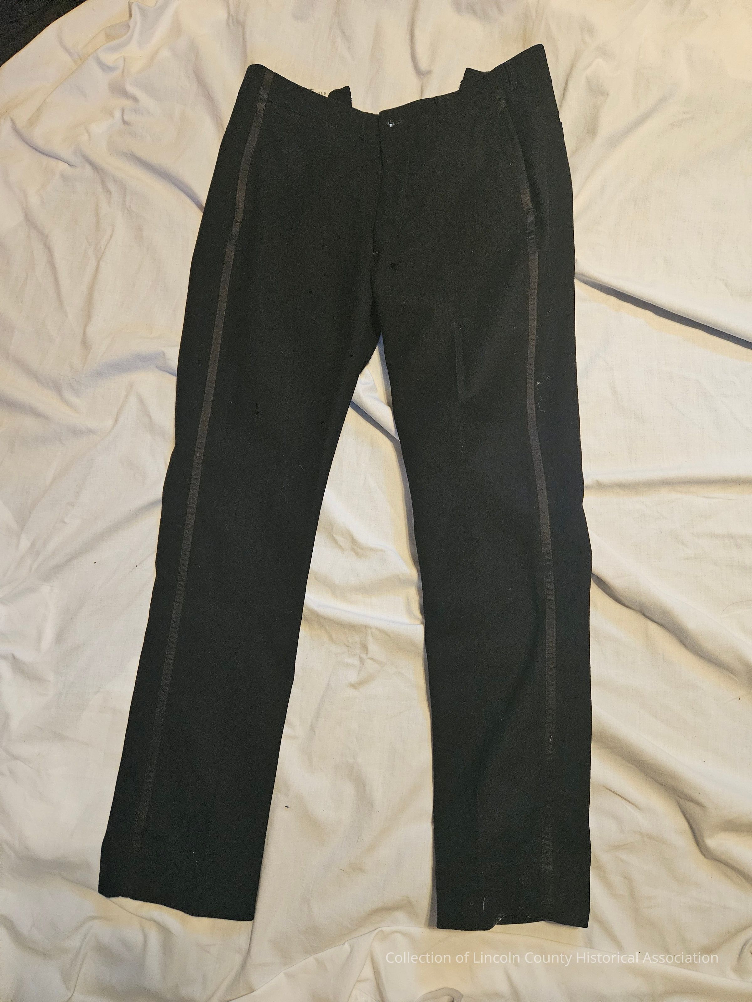 Men's black dress pants. Smooth black serge with satin trim. Satin stripe down each pant leg. Two front pockets and a four button closure. Six buttons around inside waist.Clothing/Dress/Costume Details