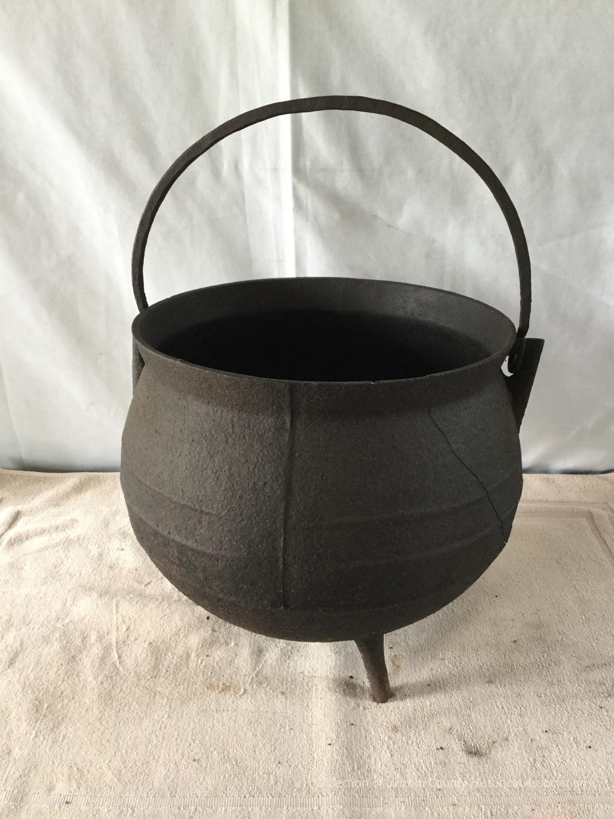 Large cast iron pot with movable handle. Stands on three short legsMade/Created