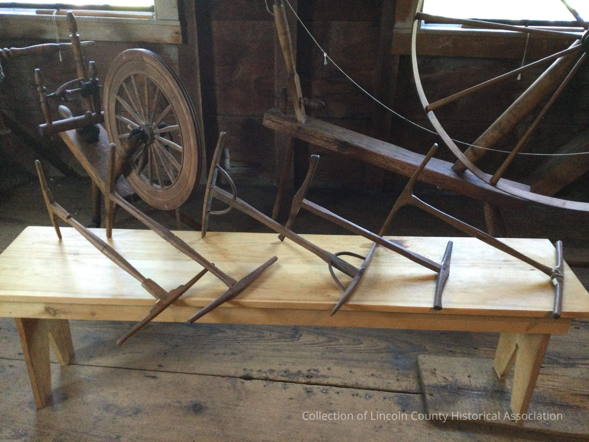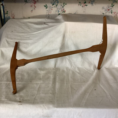 Five niddy noddies made of wood. Wooden shafts support cross pieces at either end at right angles to each other.Made/Created