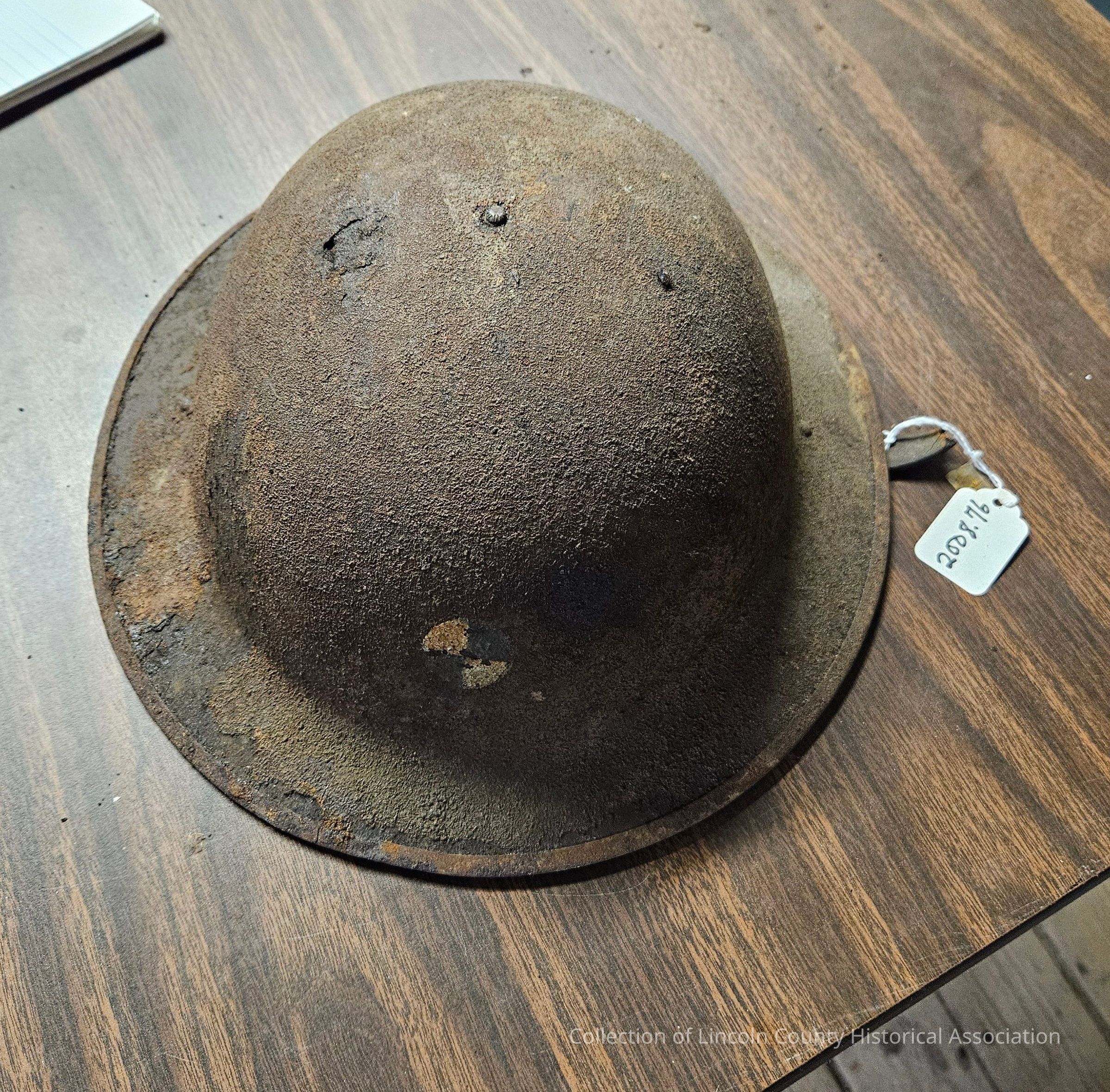 Helmet is severely corroded and rusty. Leather strap is falling apart