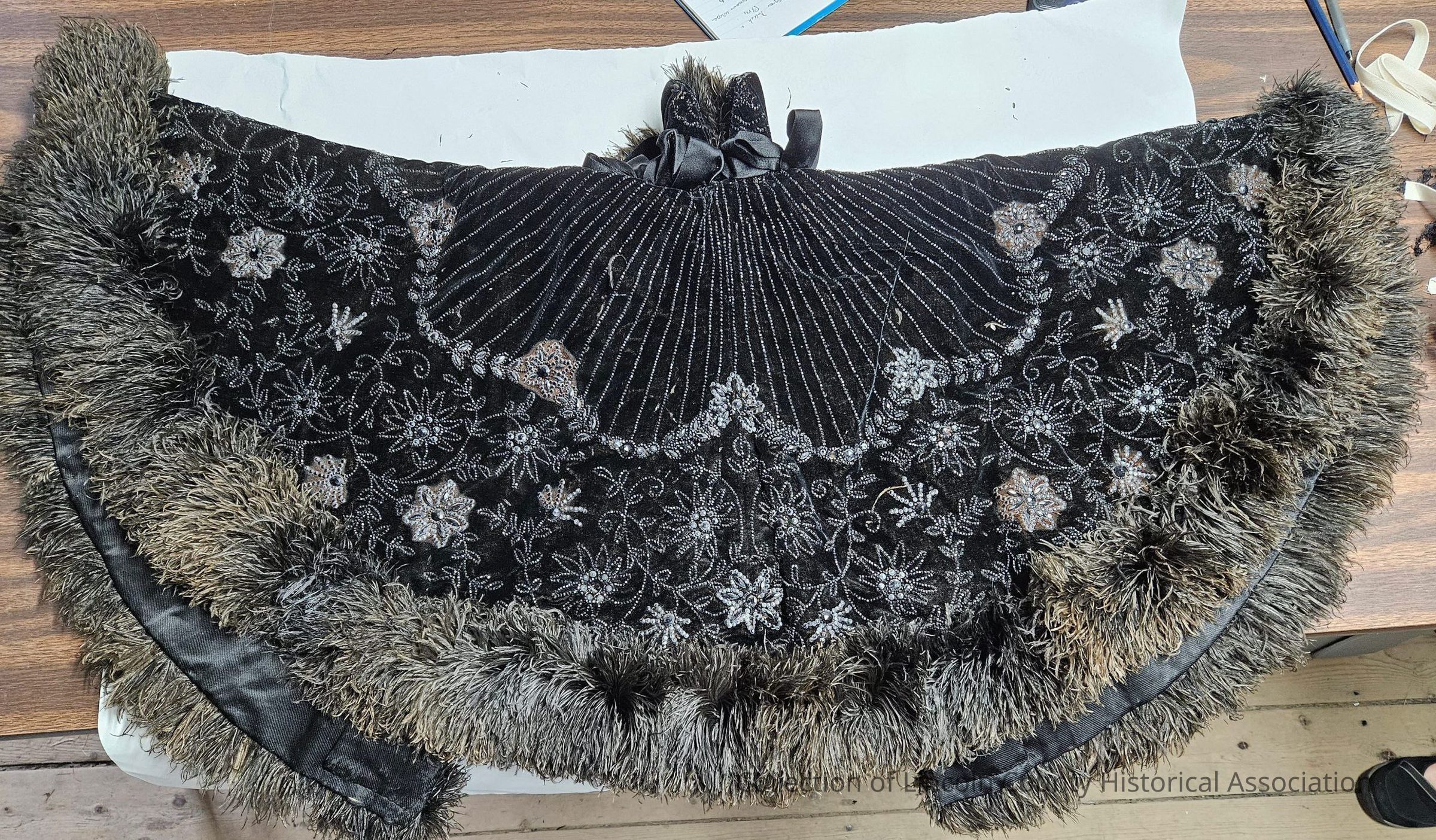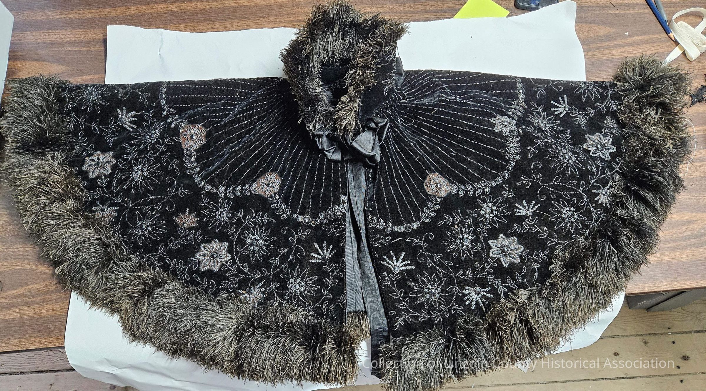 Black velvet and silk opera cape. Decorated with black beads in a floral design. Edges are fringed with feathers.
