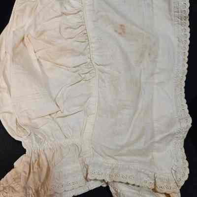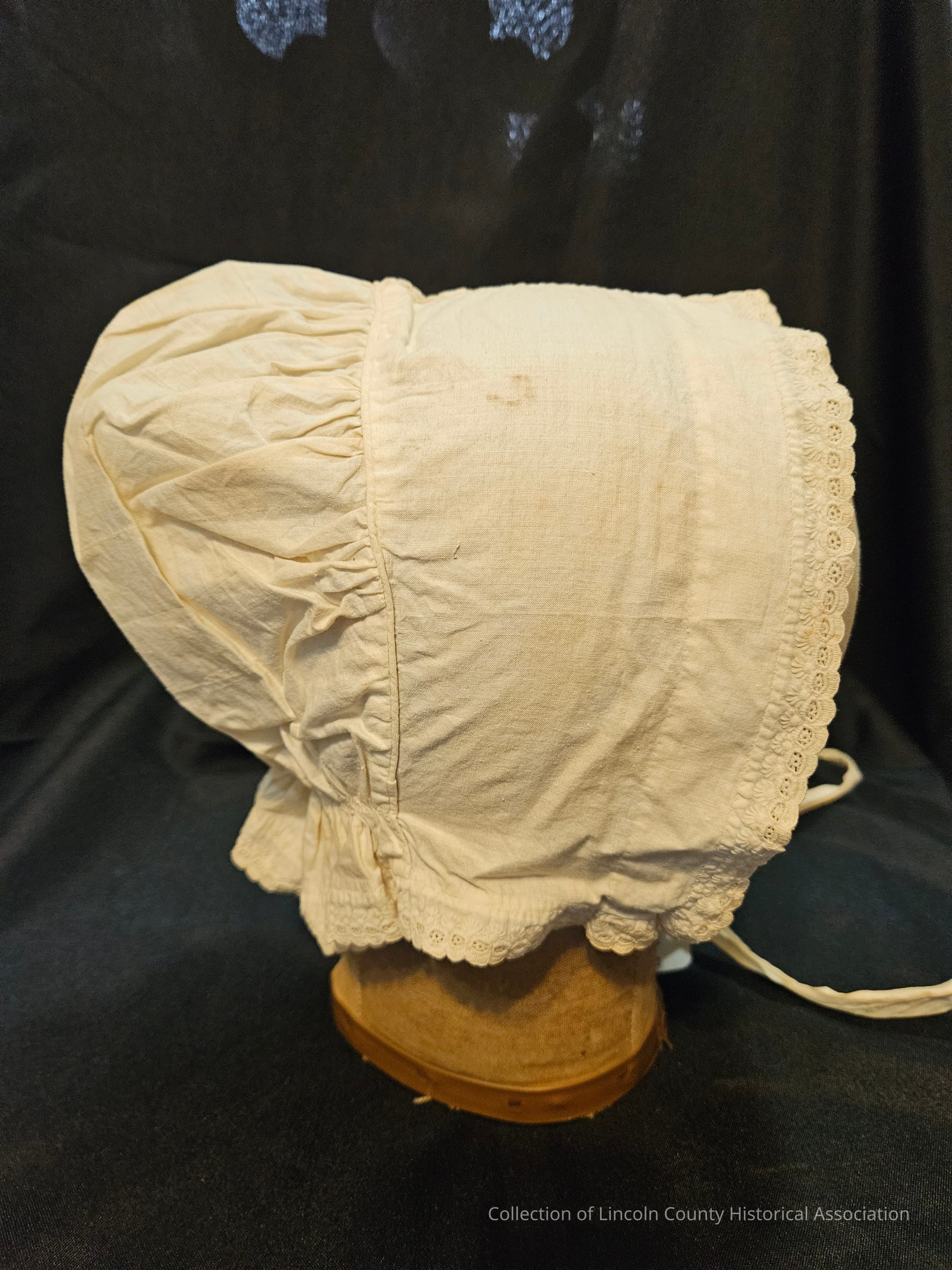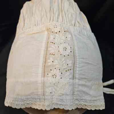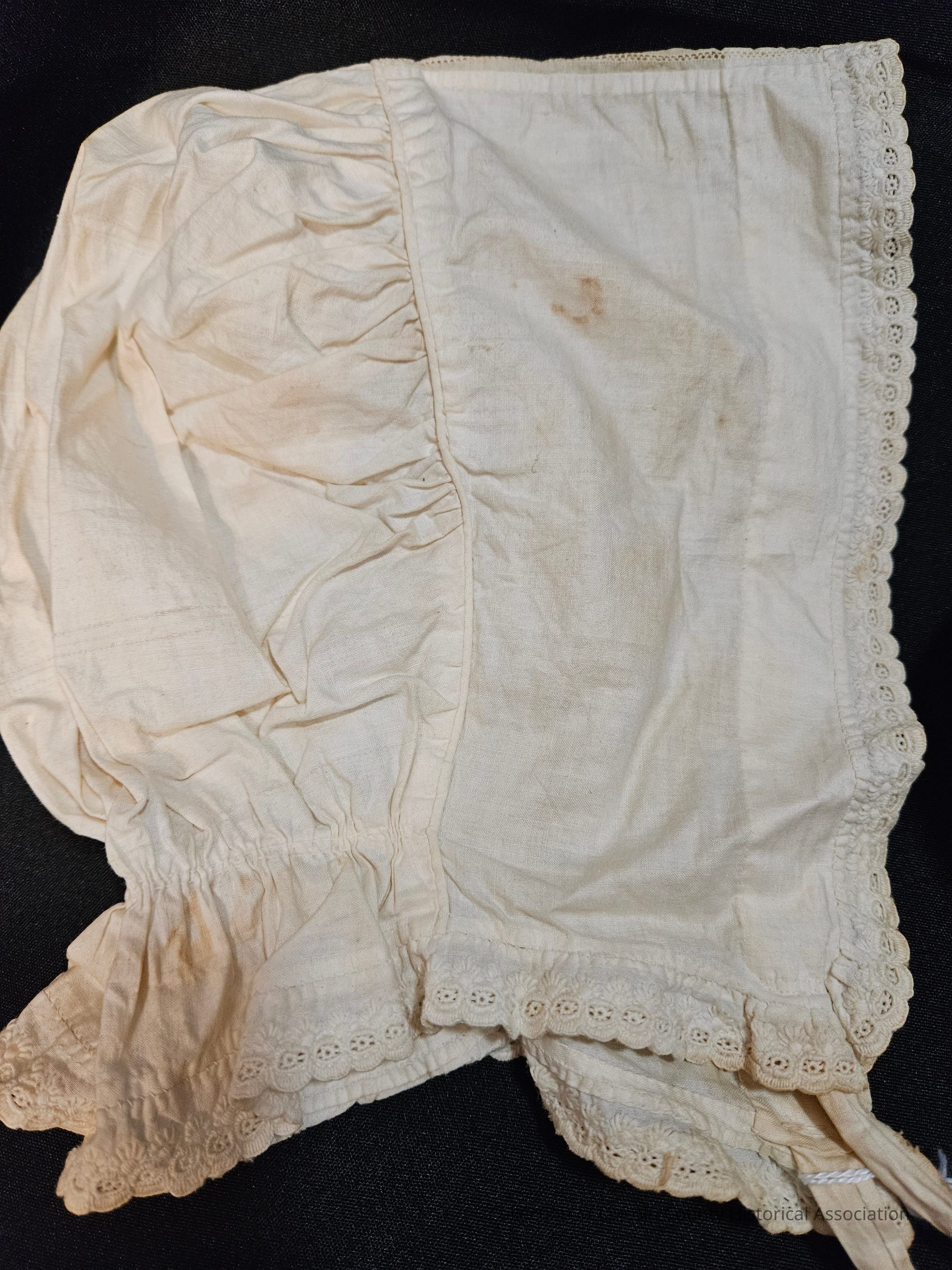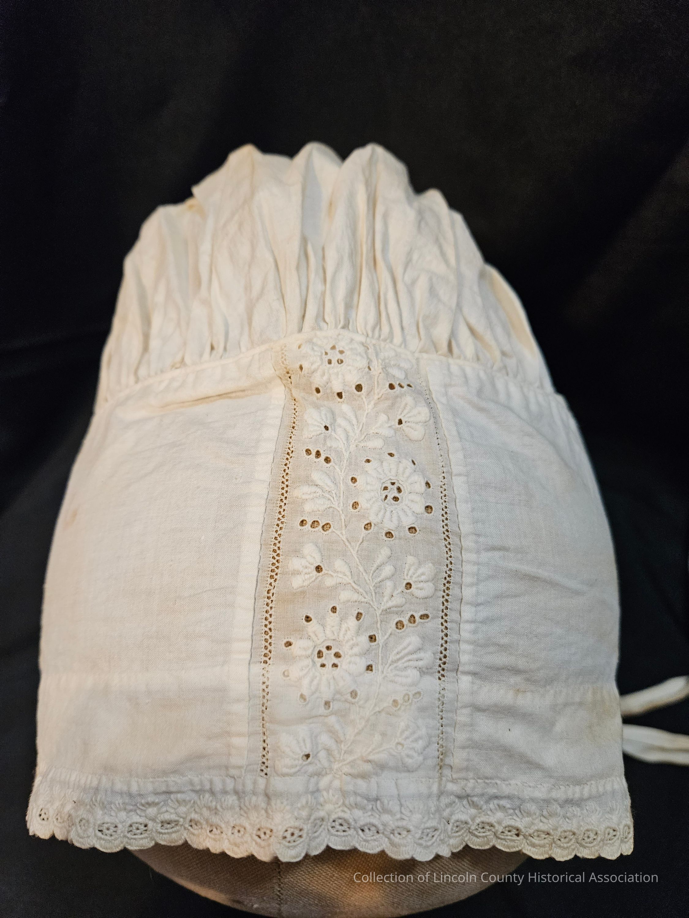 Cotton cap with embroidered flower design on top center. Embroidered edge design. Piped edge around middle of cap. Two plain cotton ties.