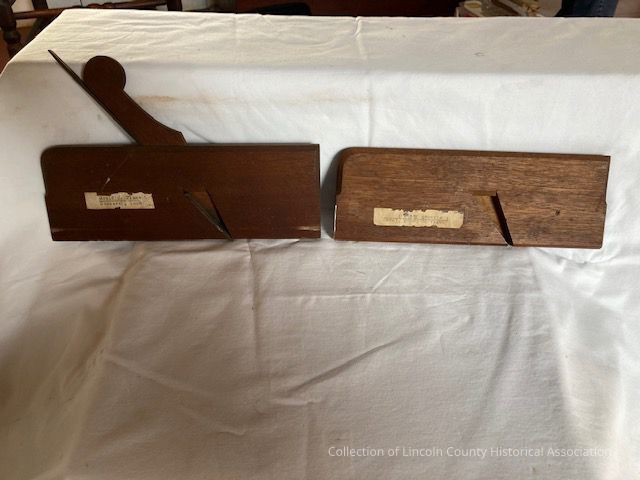 Pair of moulding planes to create grooves. Mahogany, one with steel-tipped iron blade. Each with a wooden wedge.Made/Created
