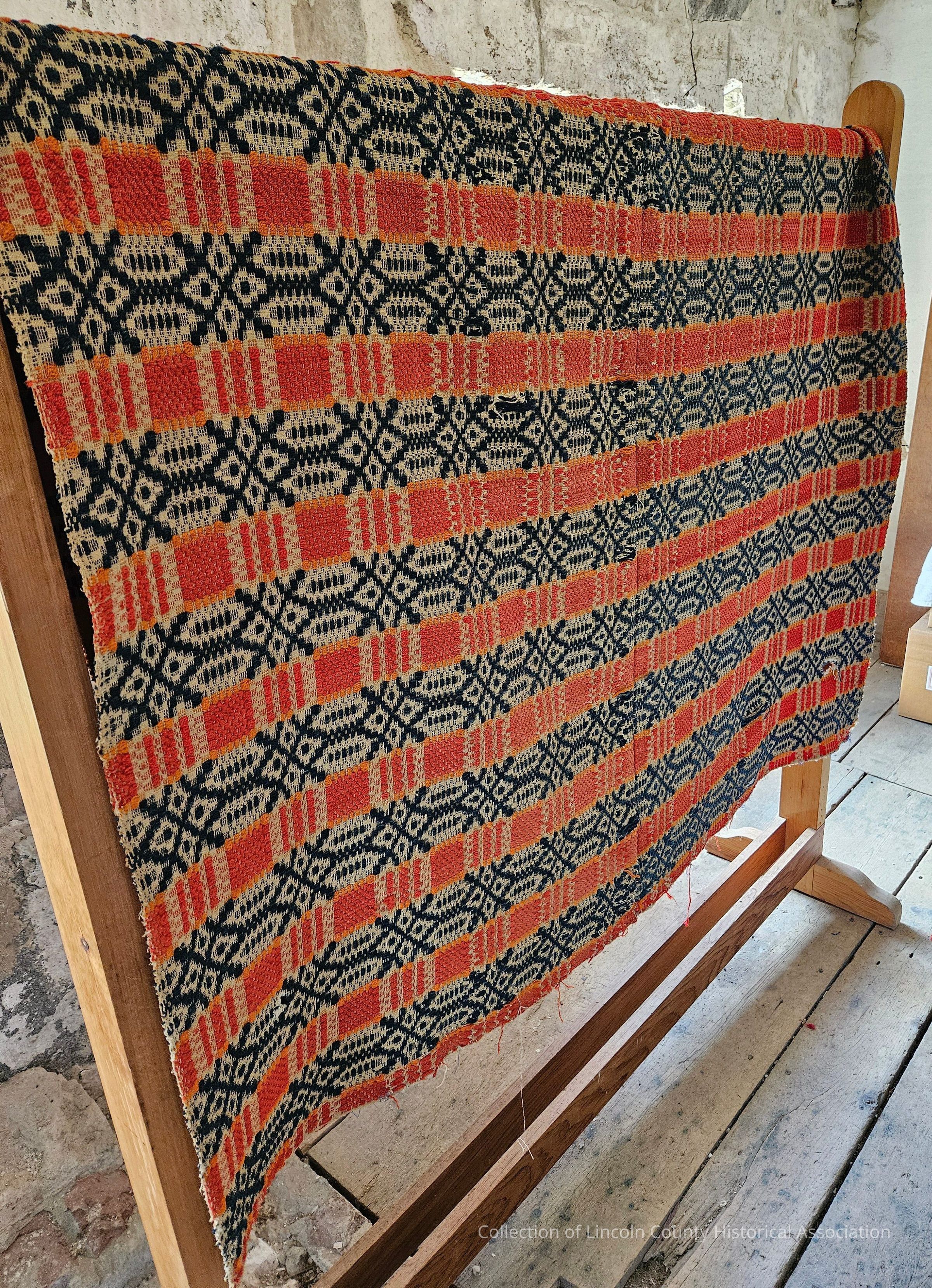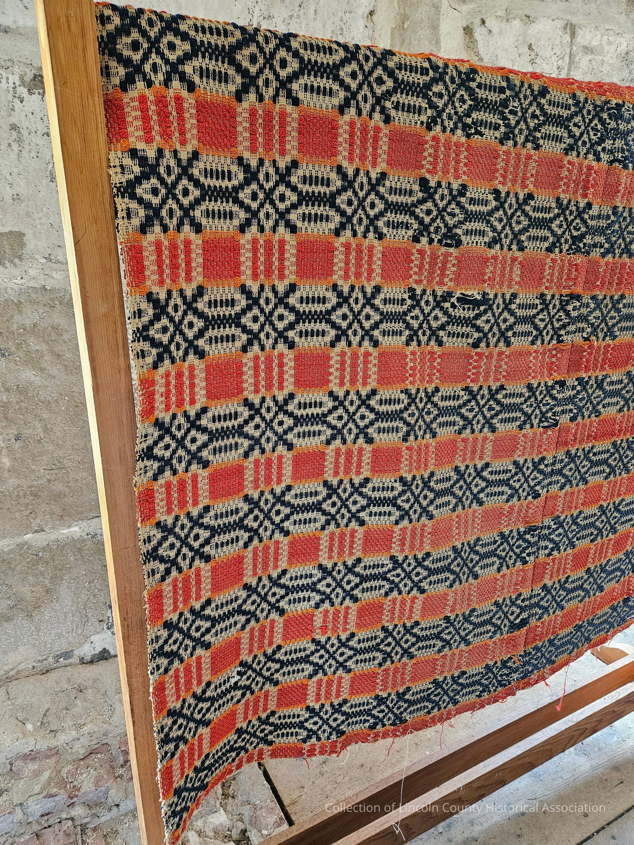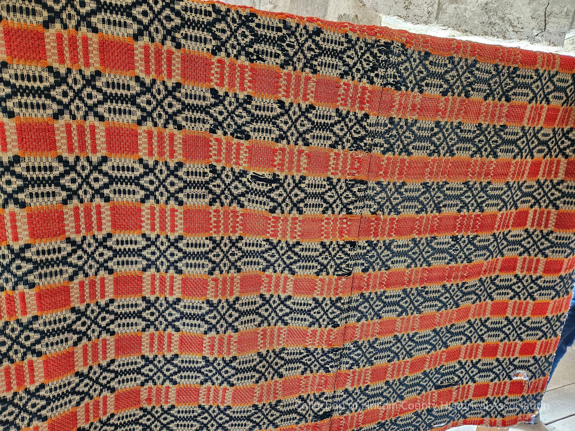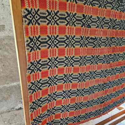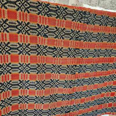 Red, white, and tan overshot linen and wool coverlet. Bands of red and blue with natural tan linen background. Line, square, and diamond design. Center seam, two 75 cm panels sewn together.Made/Created