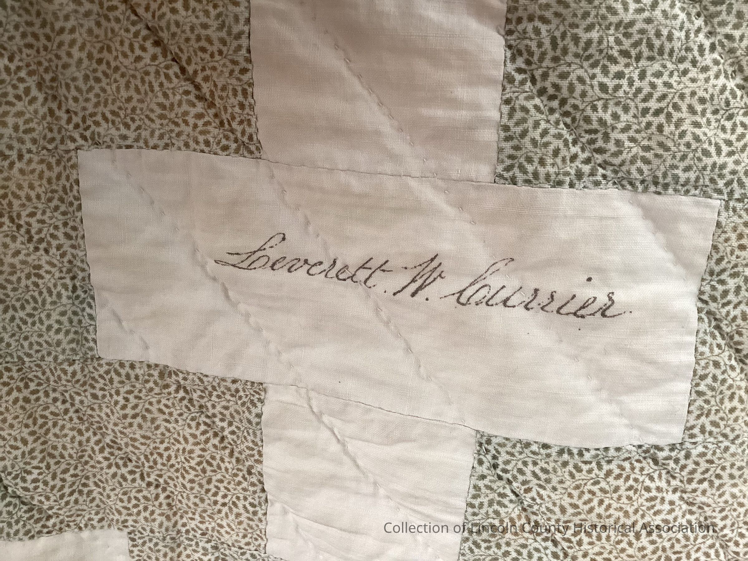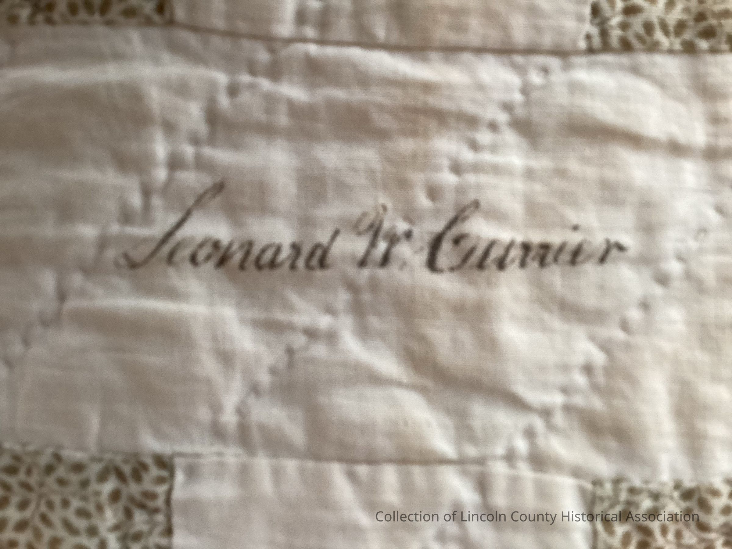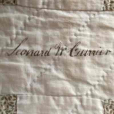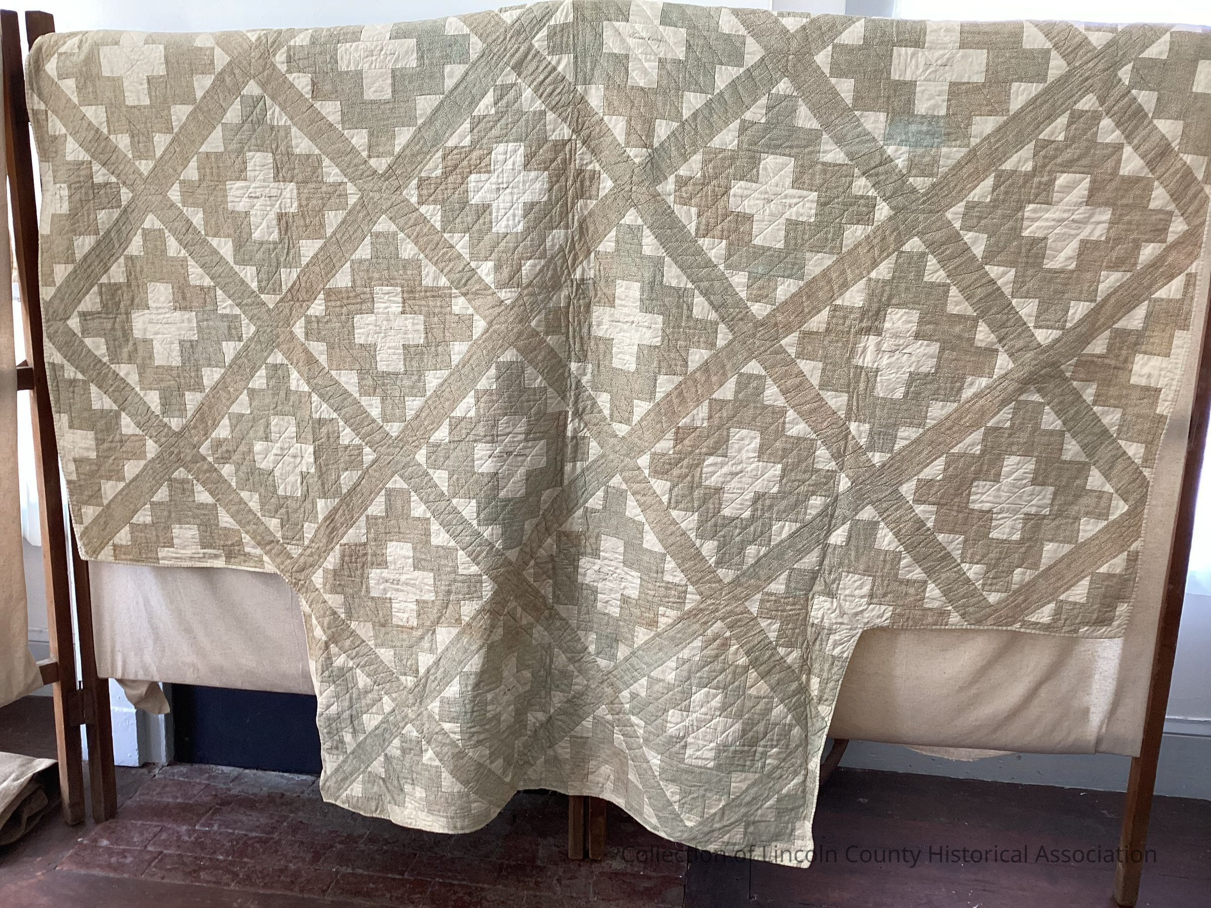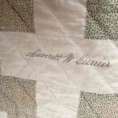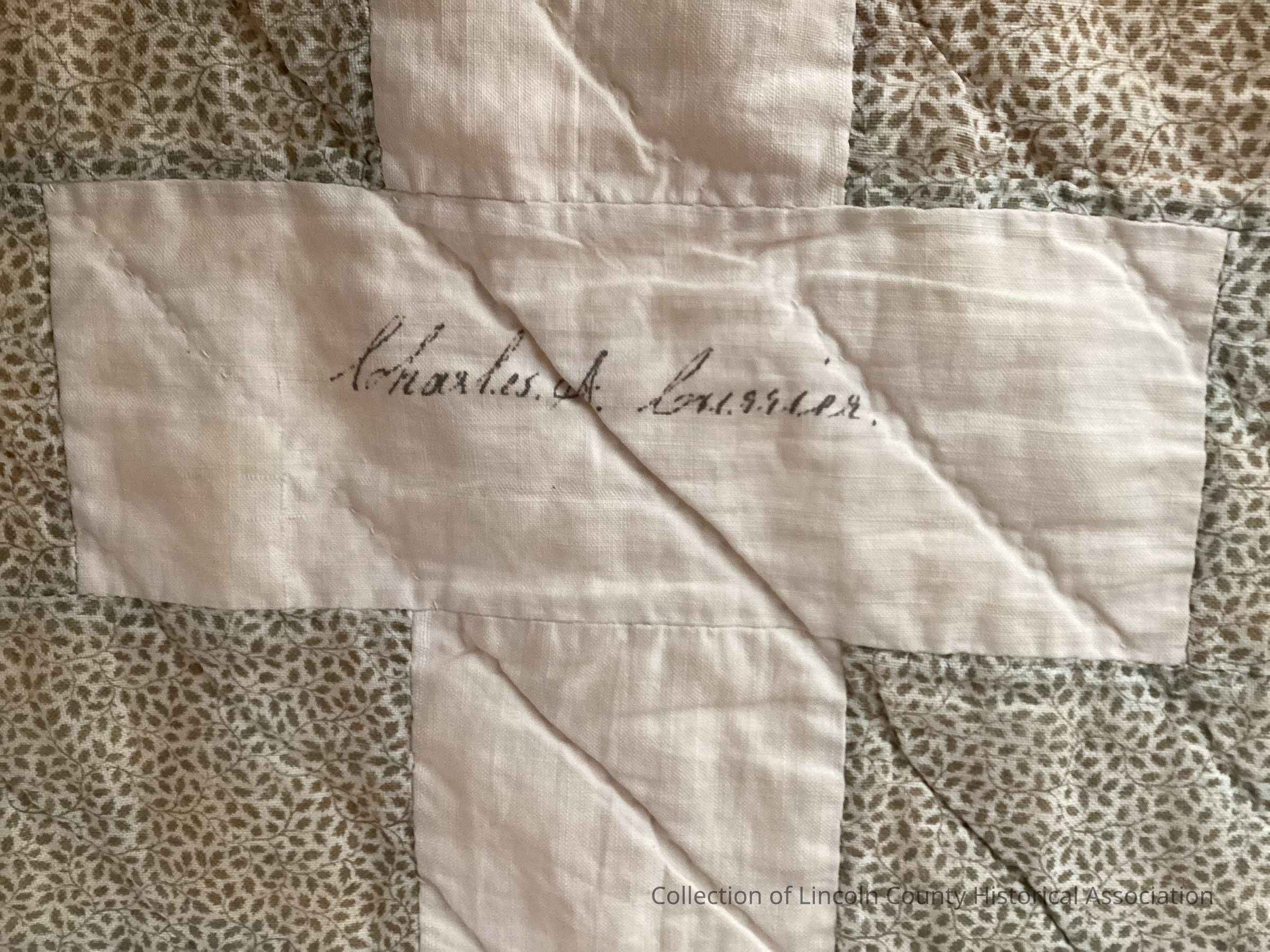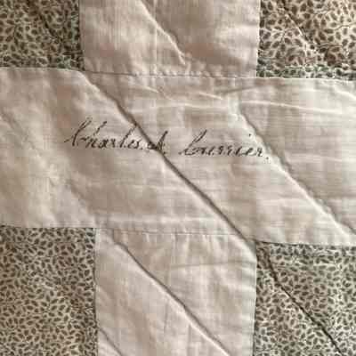 Hand pieced and hand quilted summer quilt. The pattern comprises of a simple cross in the center of a block. The handwritten signature in ink is on the center of each cross. The hand quilting is done in diagonal lines approximately 1 and 1/2 inches apart. The corners at the bottom of the quilt are squared off to accommodate the bed posts.Made/Created