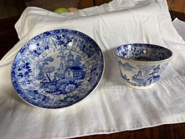 Ironstone. English blue and white transfer decoration representing an Oriental scene with a house and a boat near a river in the foreground