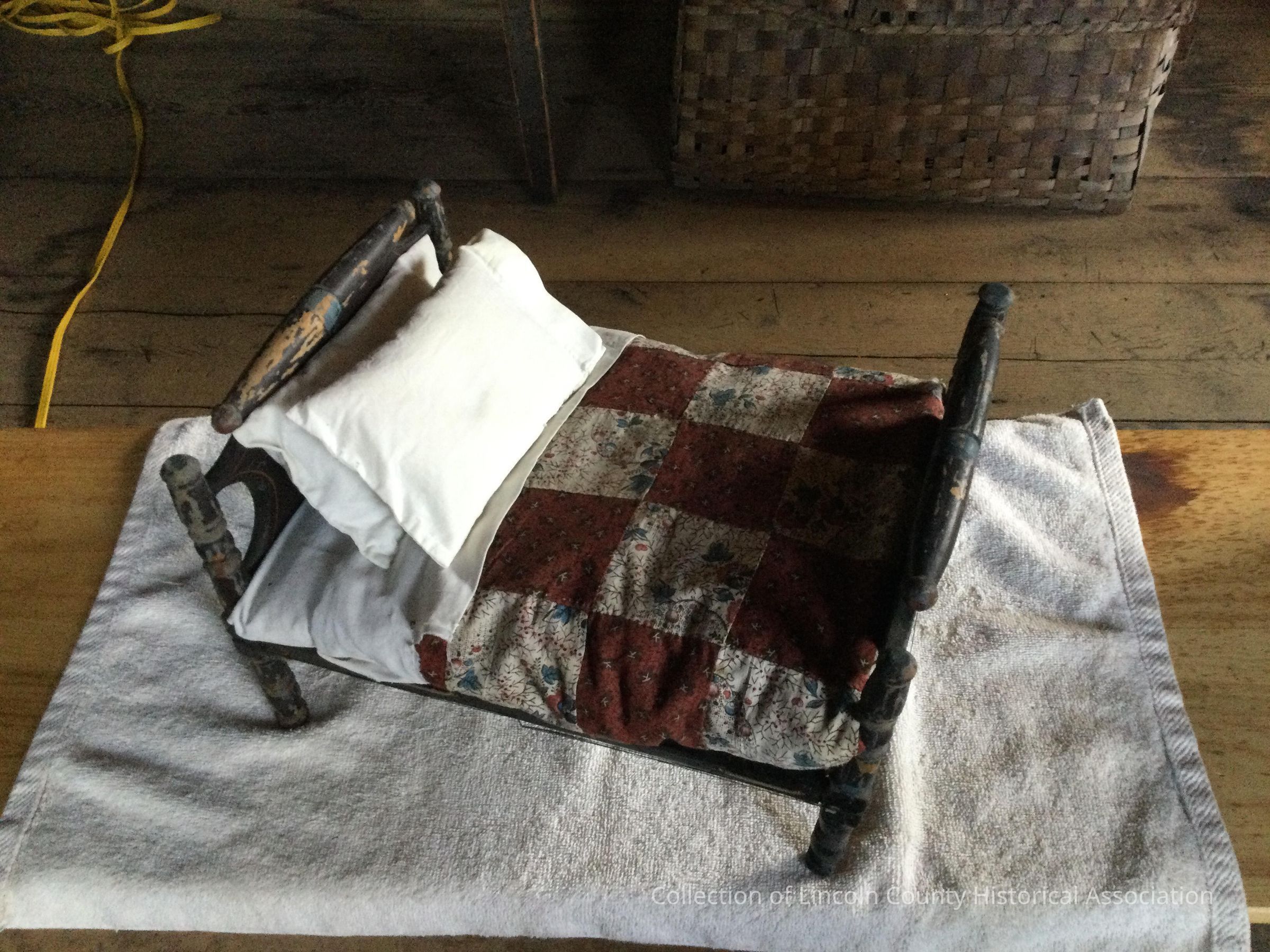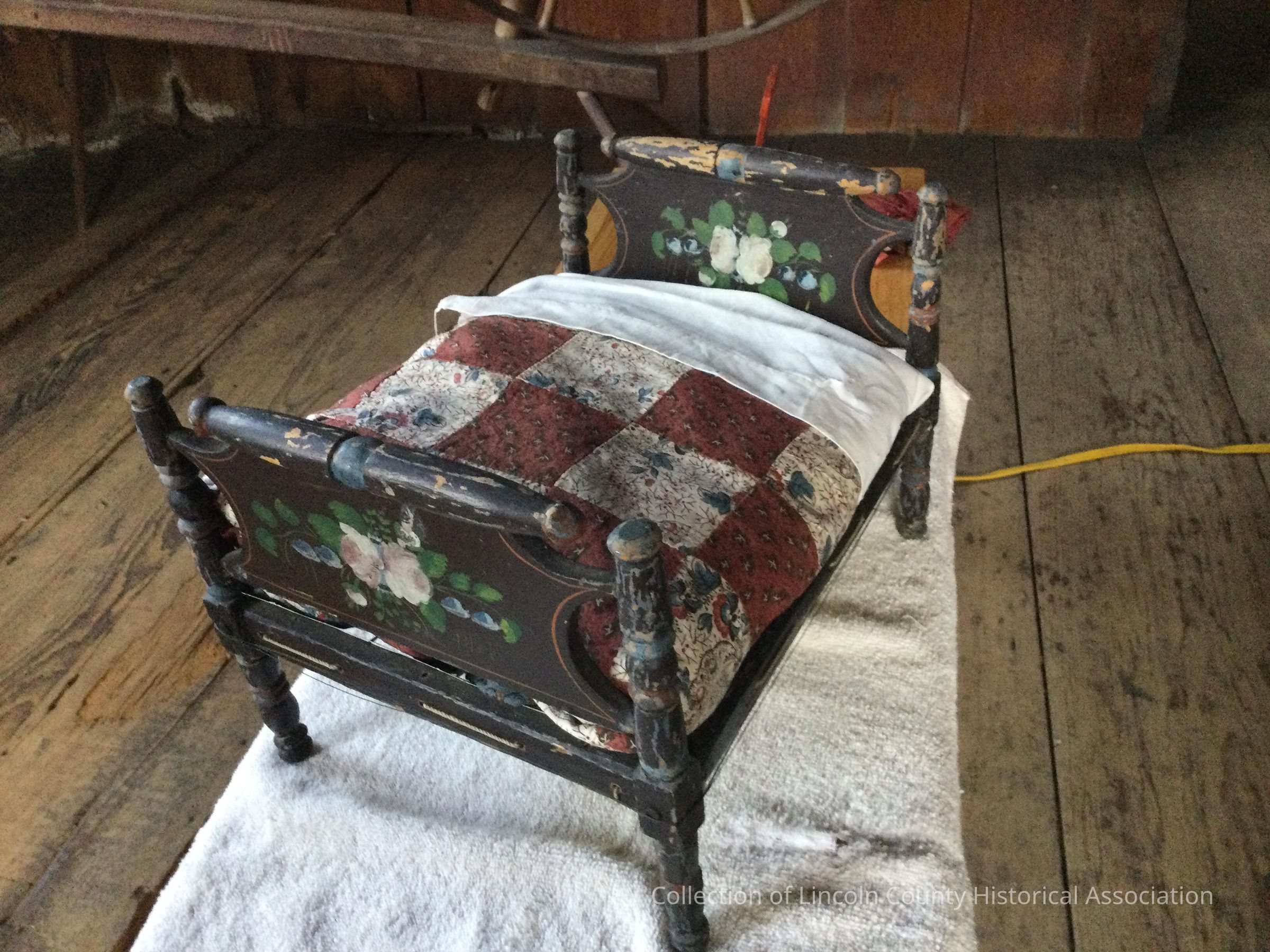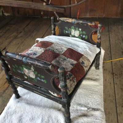 Wooden bed with rope supports for mattrass. Head and foot boards painted in various colors with striping and flowers on both sides. Linen accompanies the bedInscription/Signature/Marks
