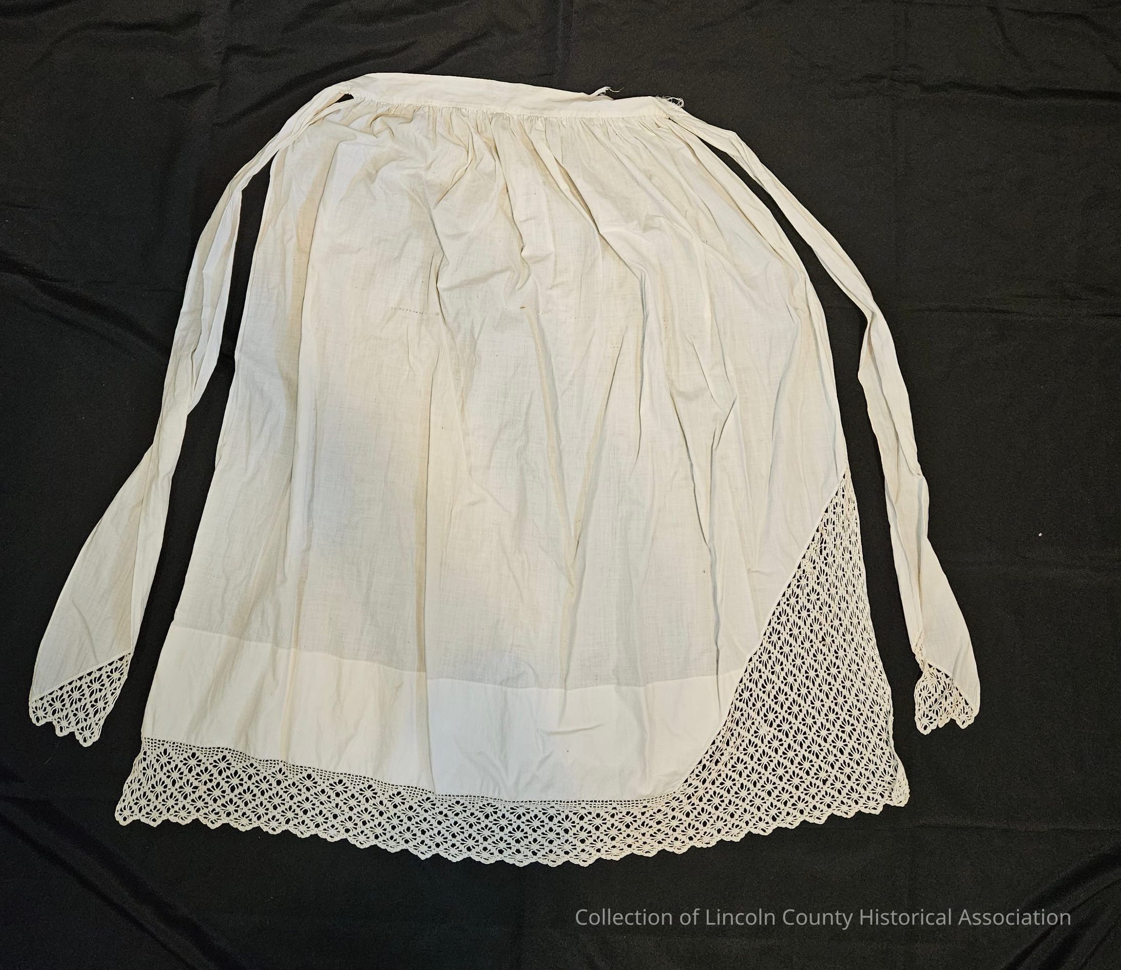 White cotton apron. Open weave lace on hem and at bottom of ties. Lace at bottom of ties is on a diagonal. One side of lace hemline is also on a diagonal. Machine stitched.