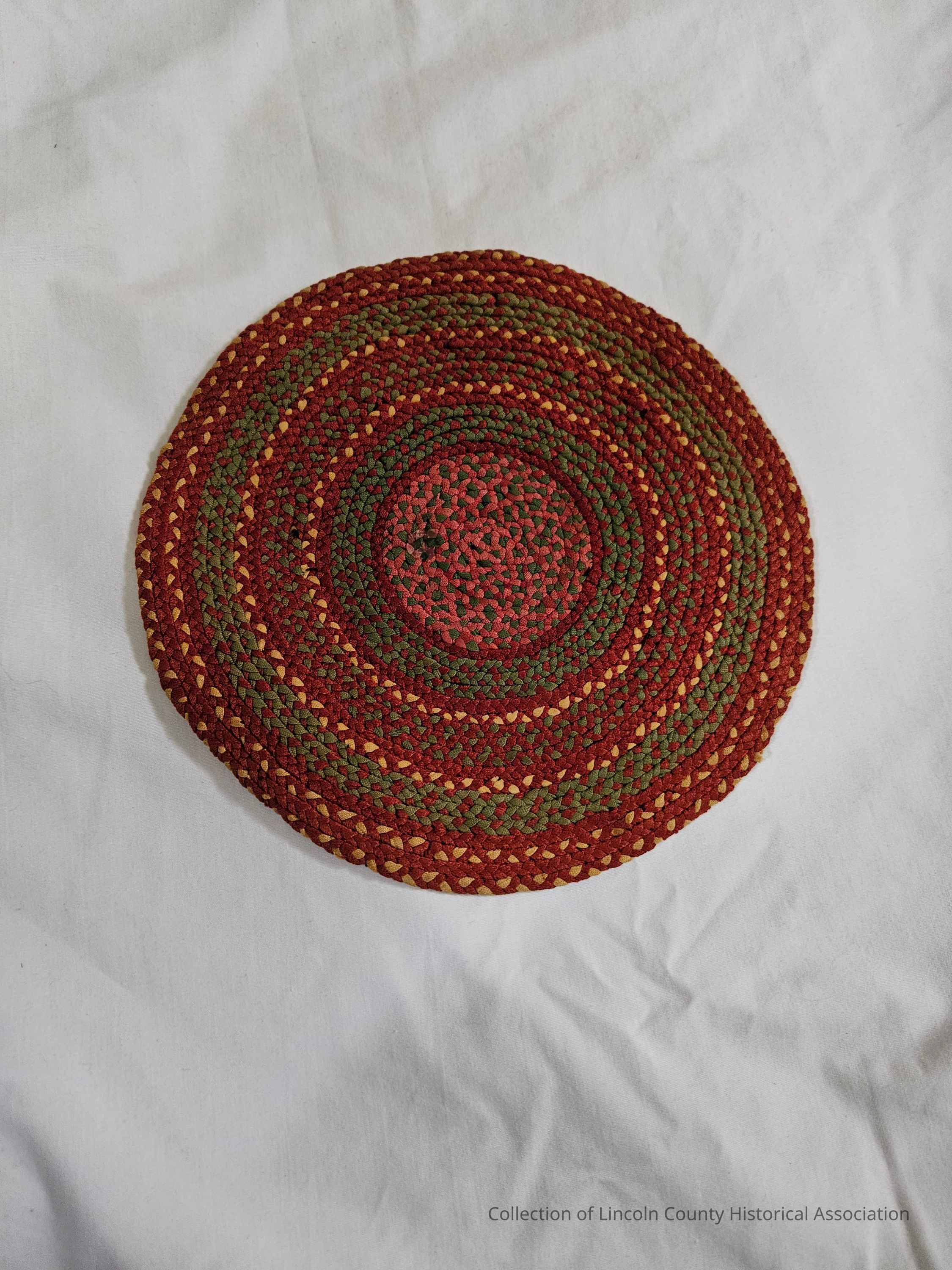Small decorative braided rug/mat. Circular in shape. Center circle is pink and green. Surrounding circles are red, green, and yellow.Made/Created