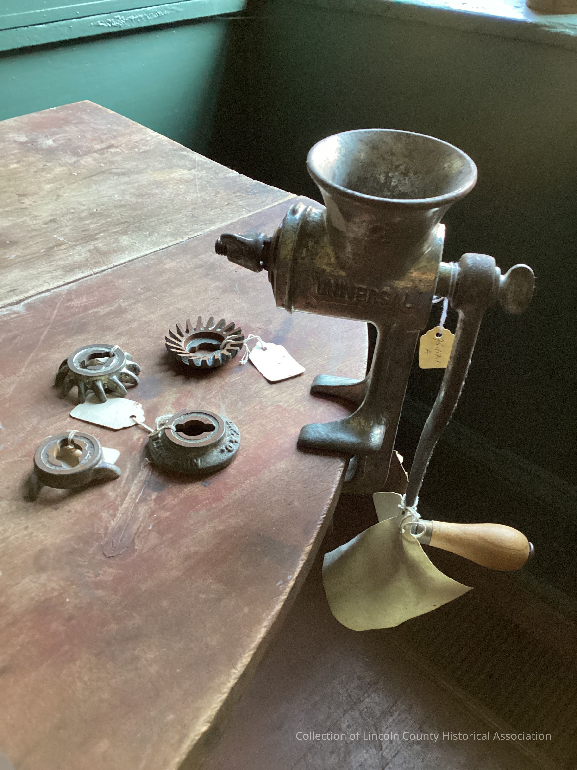 Meat (and universal) grinder. Cast iron with five grinder accessories and instruction leaflet. Metal hand crank with its wooden handle.