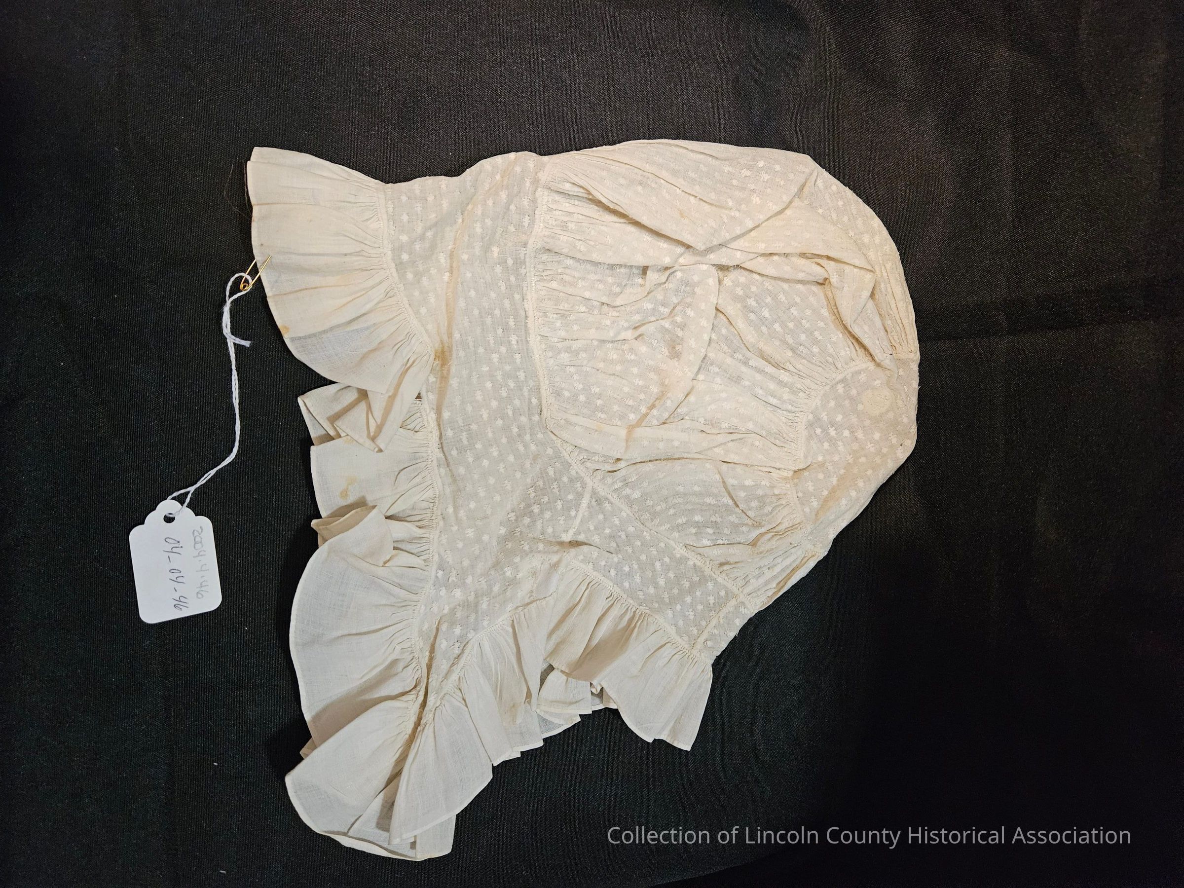 Women's white cotton day cap. Ruffled edges. Small embroidered leaf motifs. "Mary C. Murray" printed lightly on the side of cap.Clothing/Dress/Costume Details