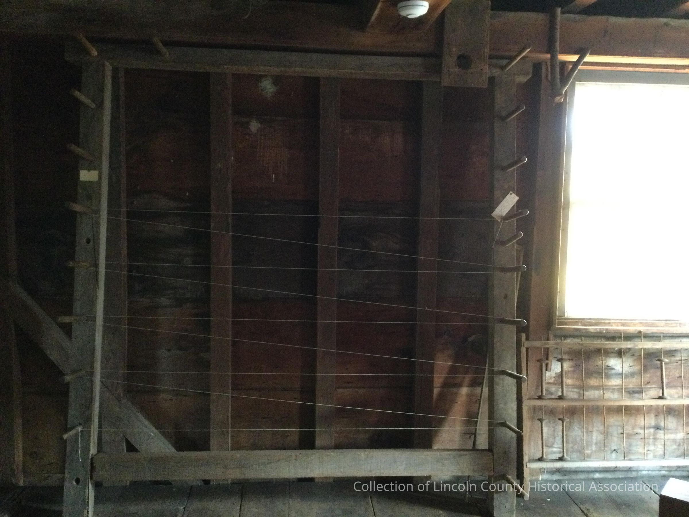 Large warping board comprised of squared beams. The longer vertically set beams have a series of pegs inserted into them at regular intervals. Frame likely made of oak whereas the pegs are either maple or ash.