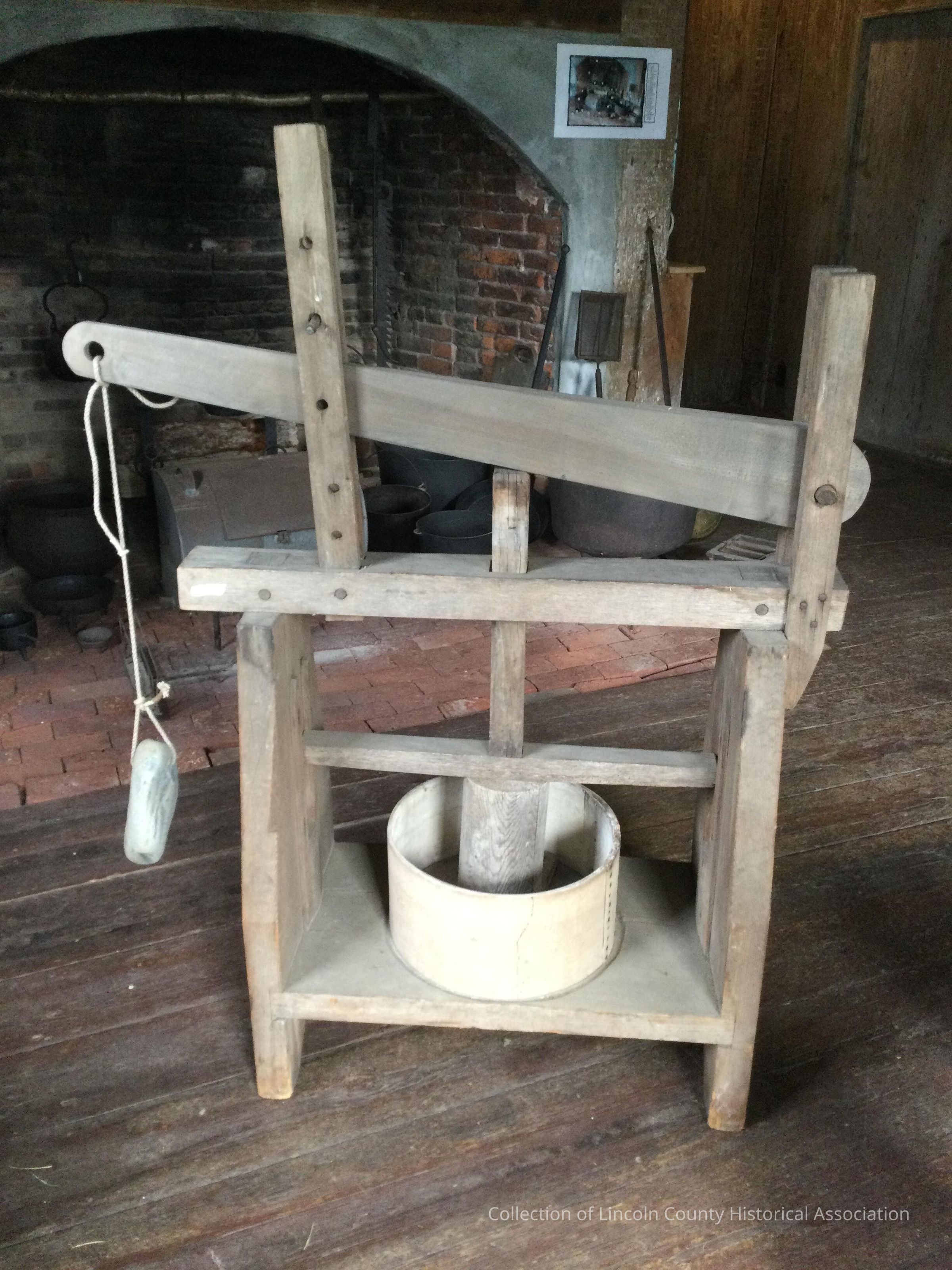 Cheese press made primarily of red oak. With an arm that can be raised and lowered and which has a weight suspended from its end. Weight of arm presses against a vertical shaft which, in turn, presses the wheel of cheese to remove any excess whey.Made/Created