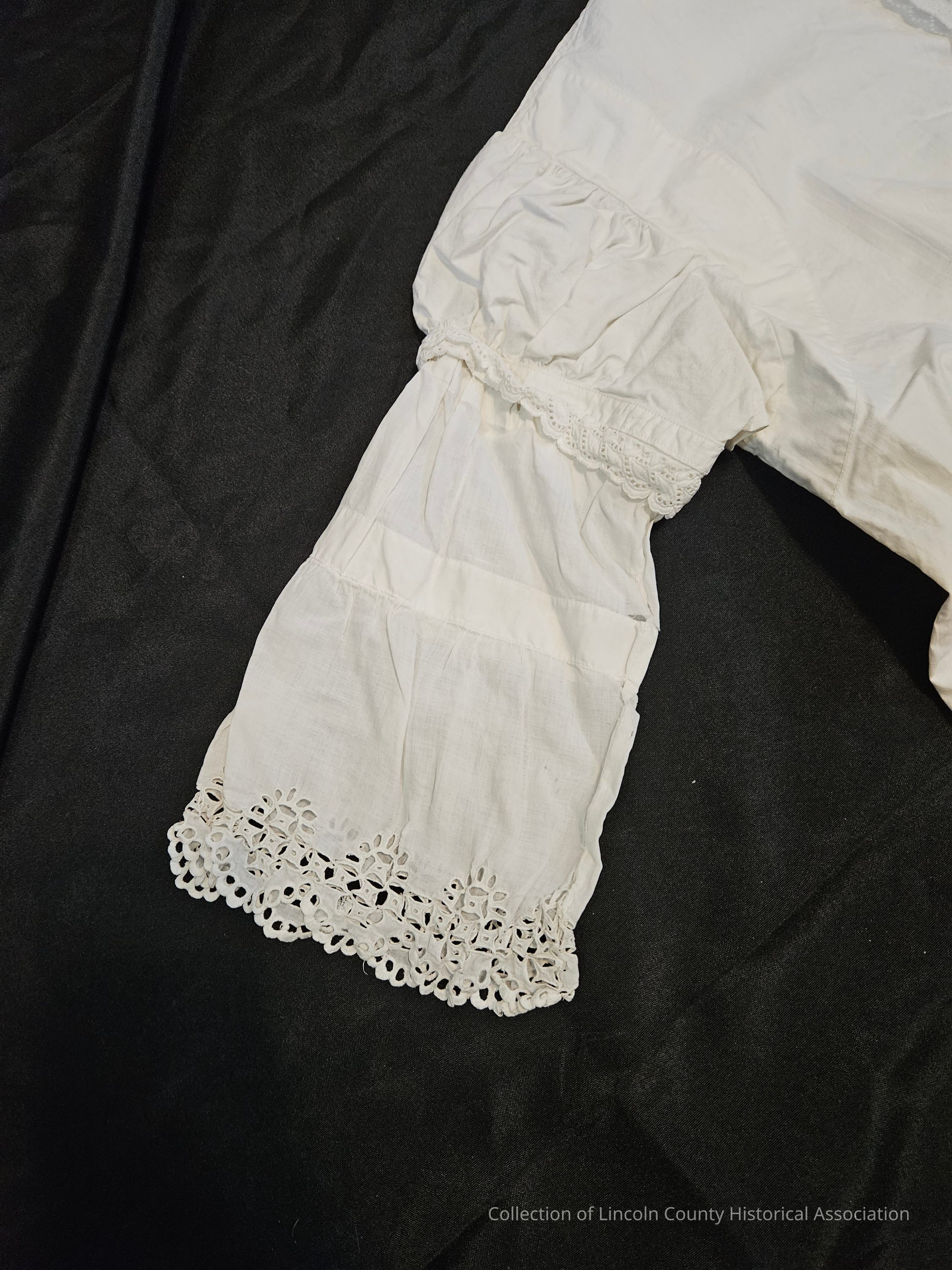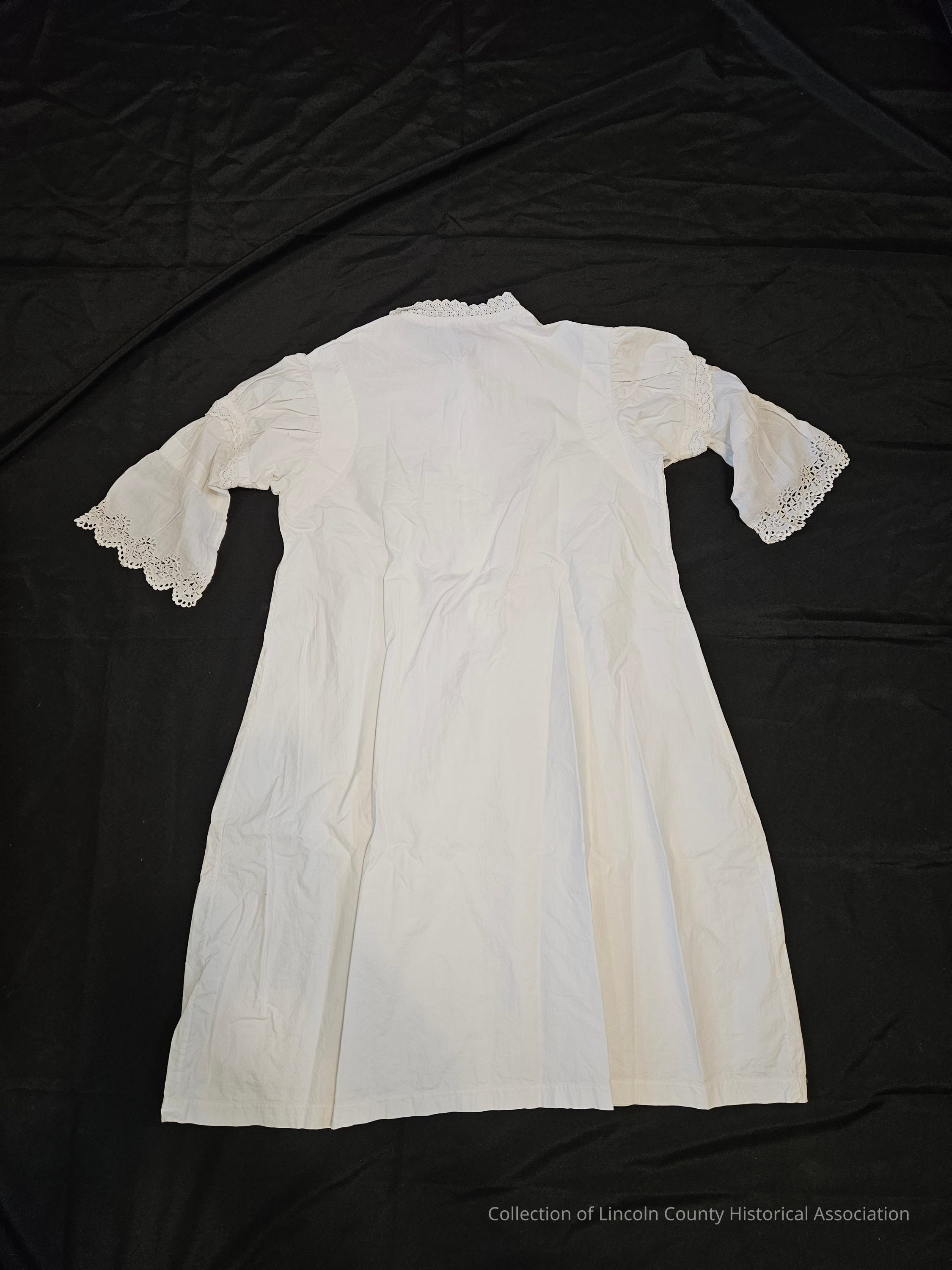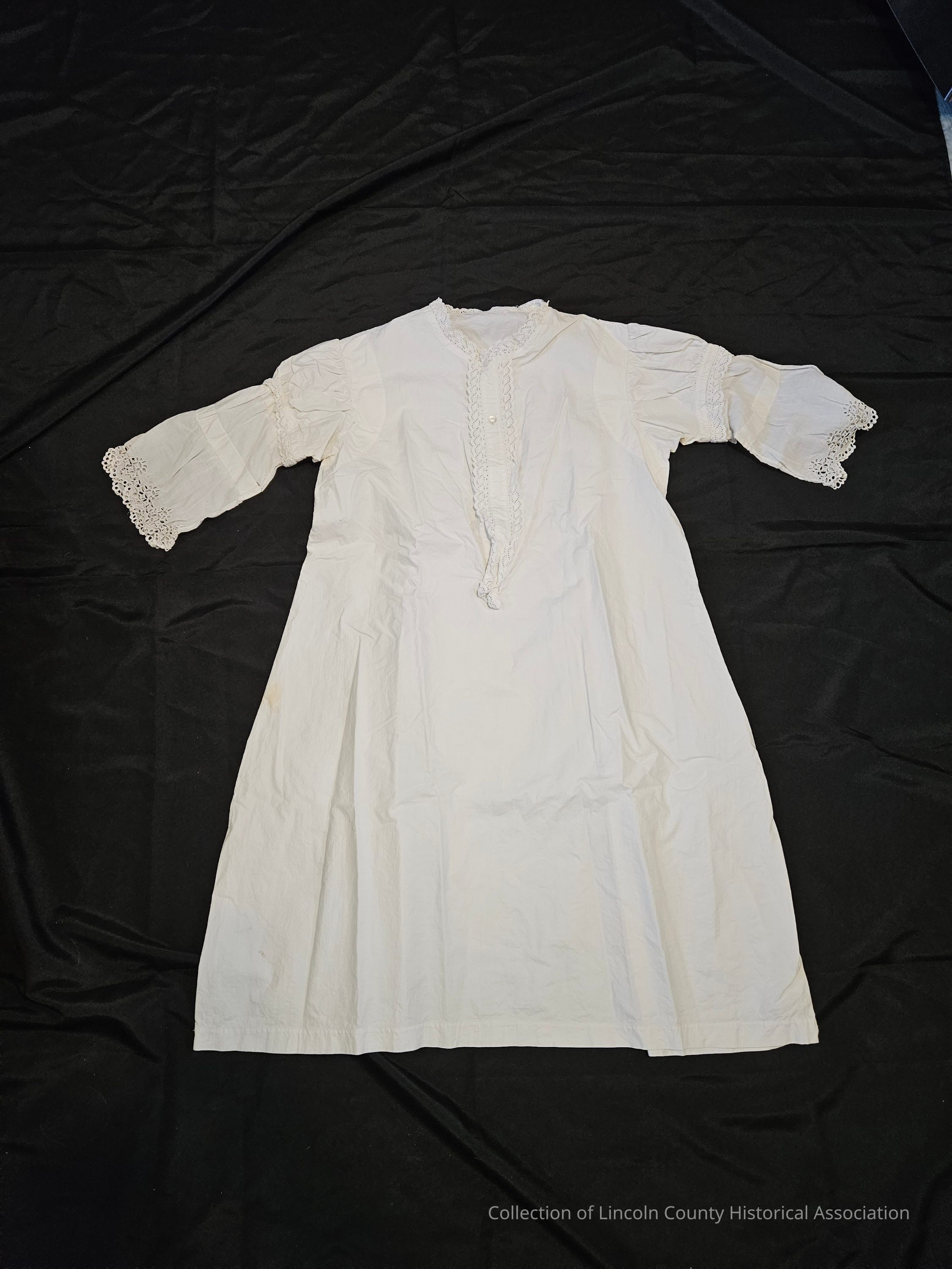 White muslin women's chemise/nightgown. Eyelet trim at end of sleeves. Lace edges around collar and around center button strip. Two buttons at the center. Bottom half of sleeves are removable to make sleeves shorter.Clothing/Dress/Costume Details