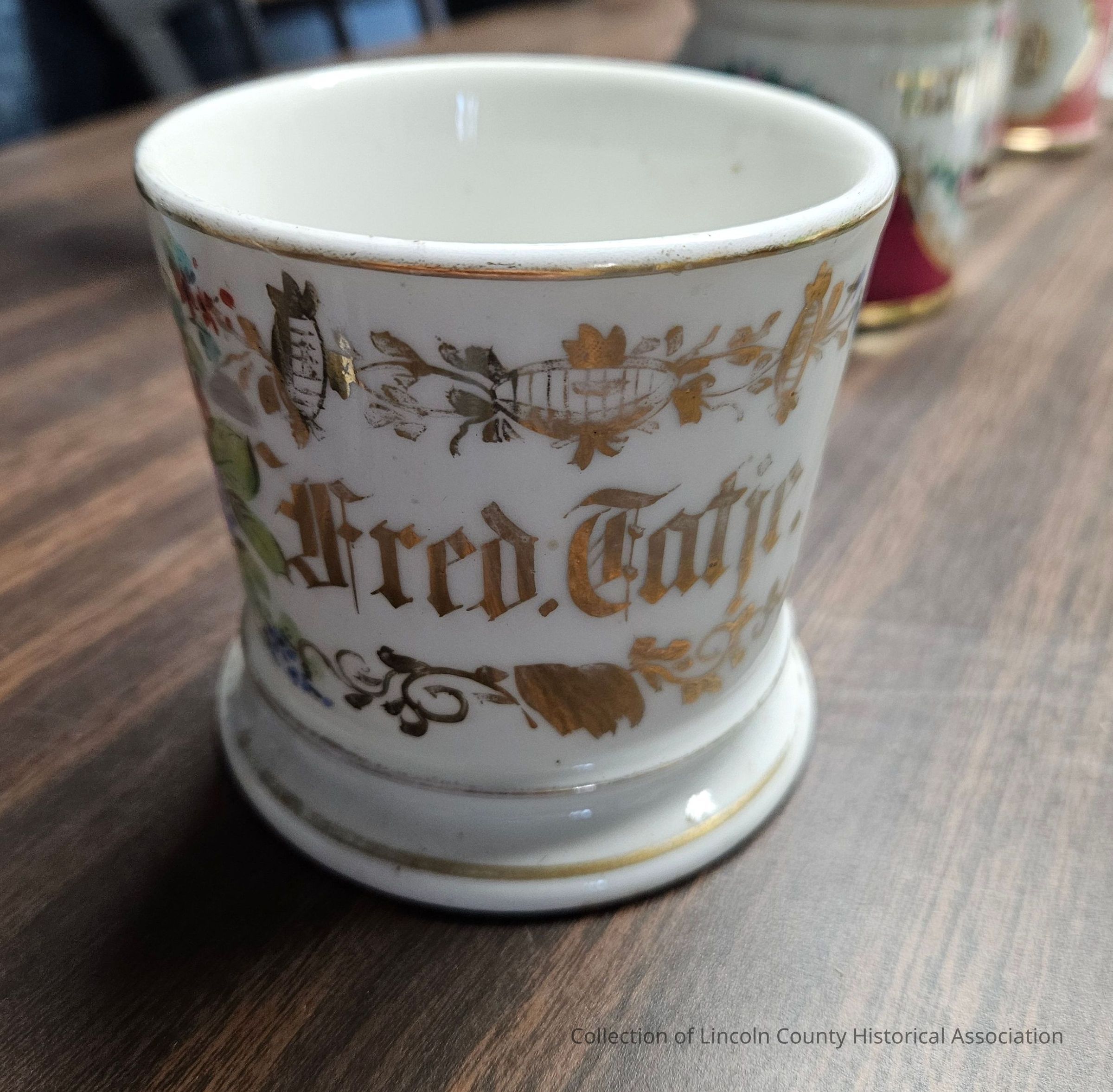 White shaving mug. Gold floral design and gold around rim. Gold fancy script in center that reads "Fred Latie."Made/Created