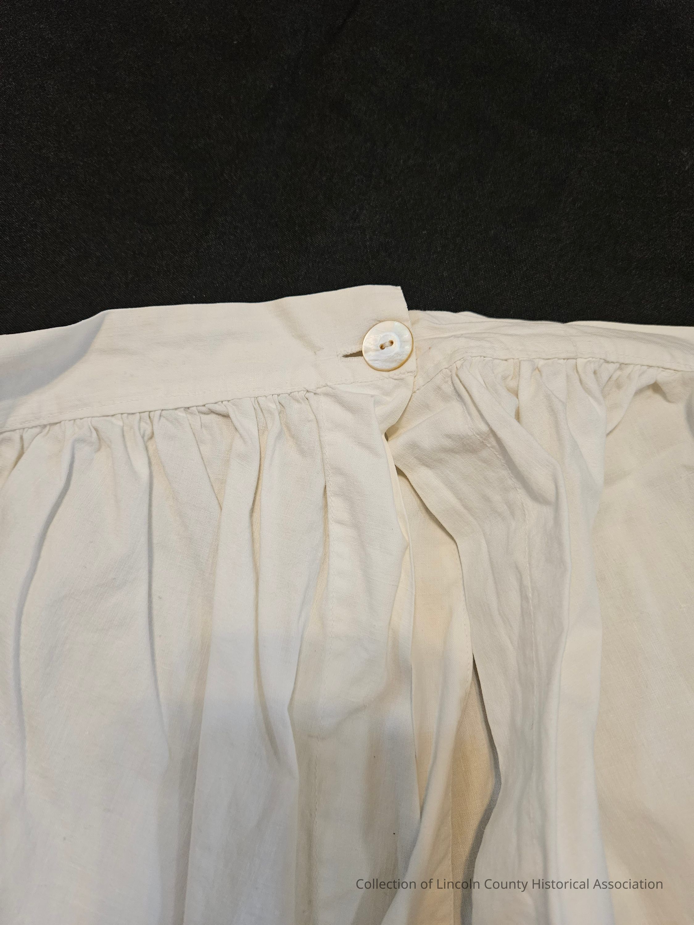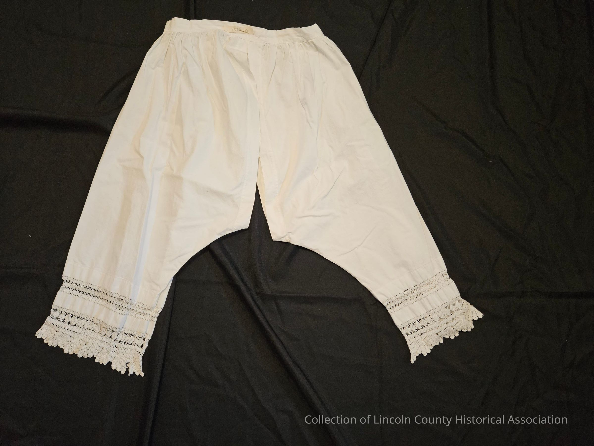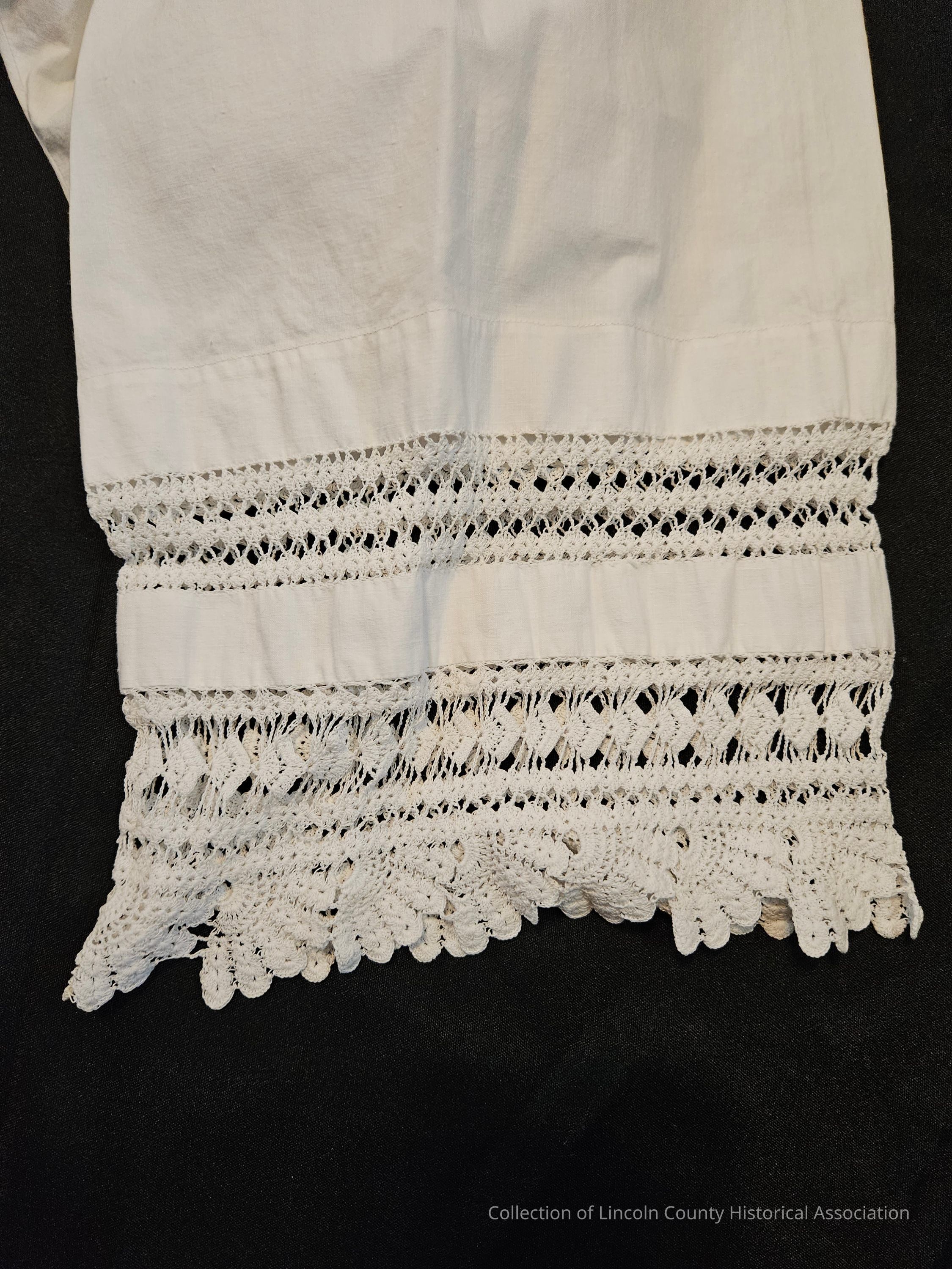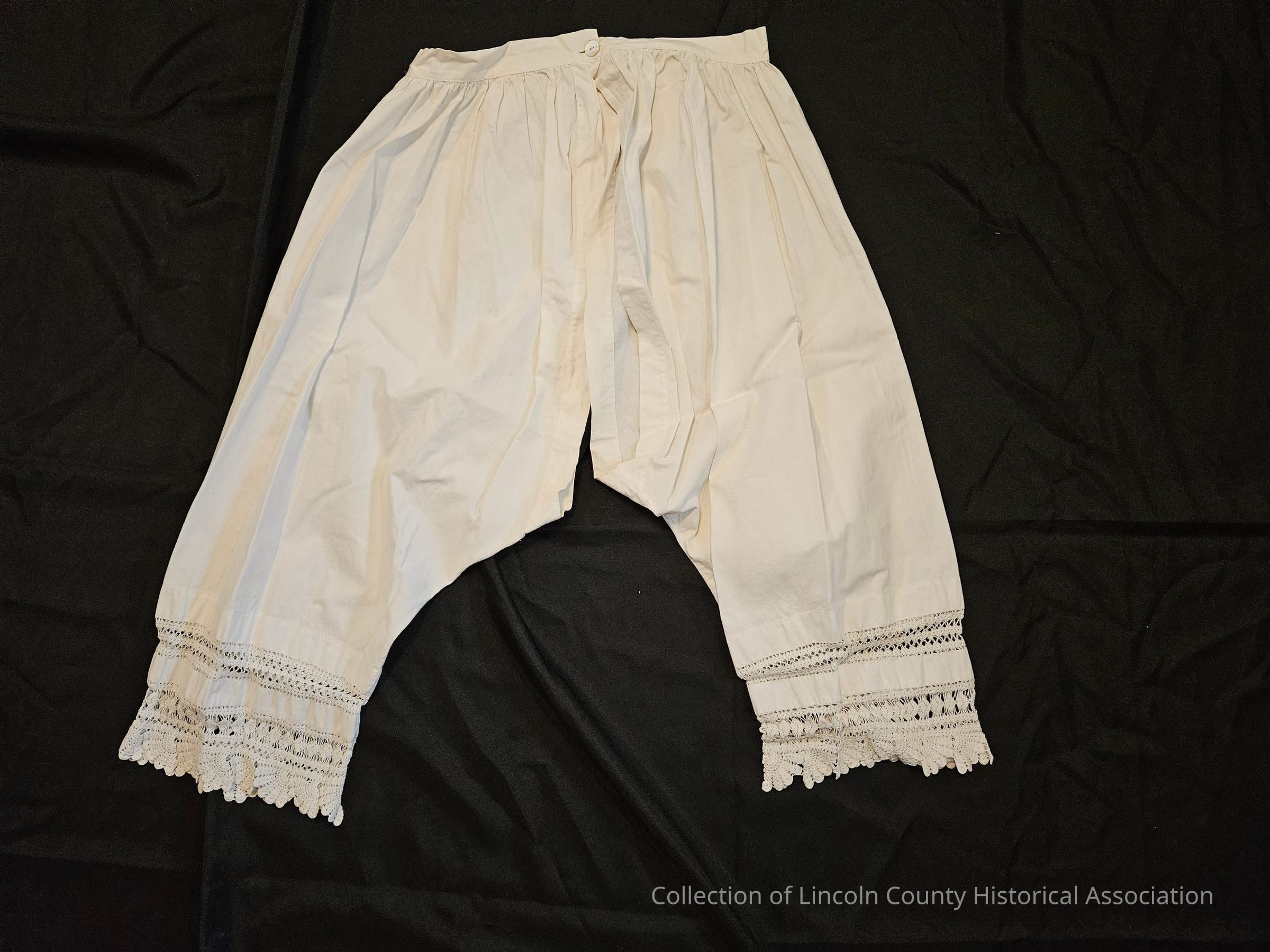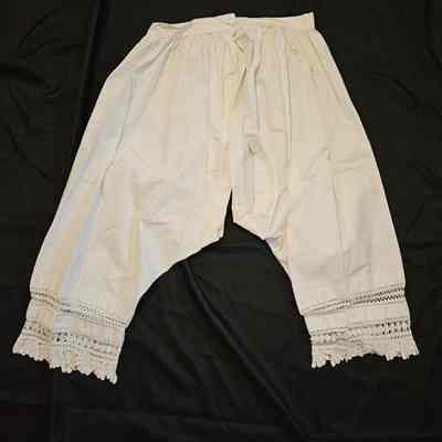 White cotton women's underpants/drawers. Single button at waist. Crocheted diamond and fan designs at base of legs. Fabric is open/not sewed together at crotch and down inside of legs.Clothing/Dress/Costume Details