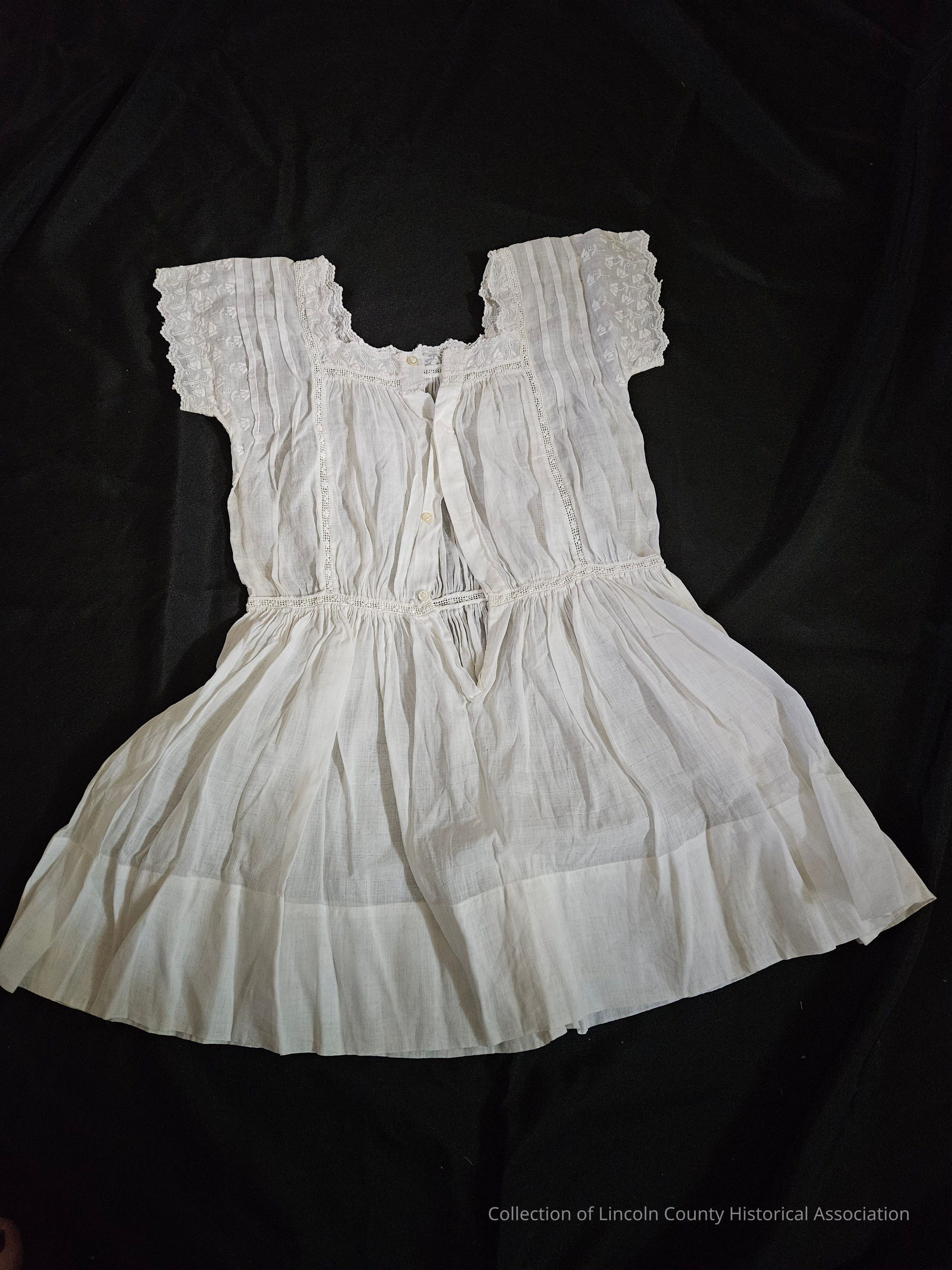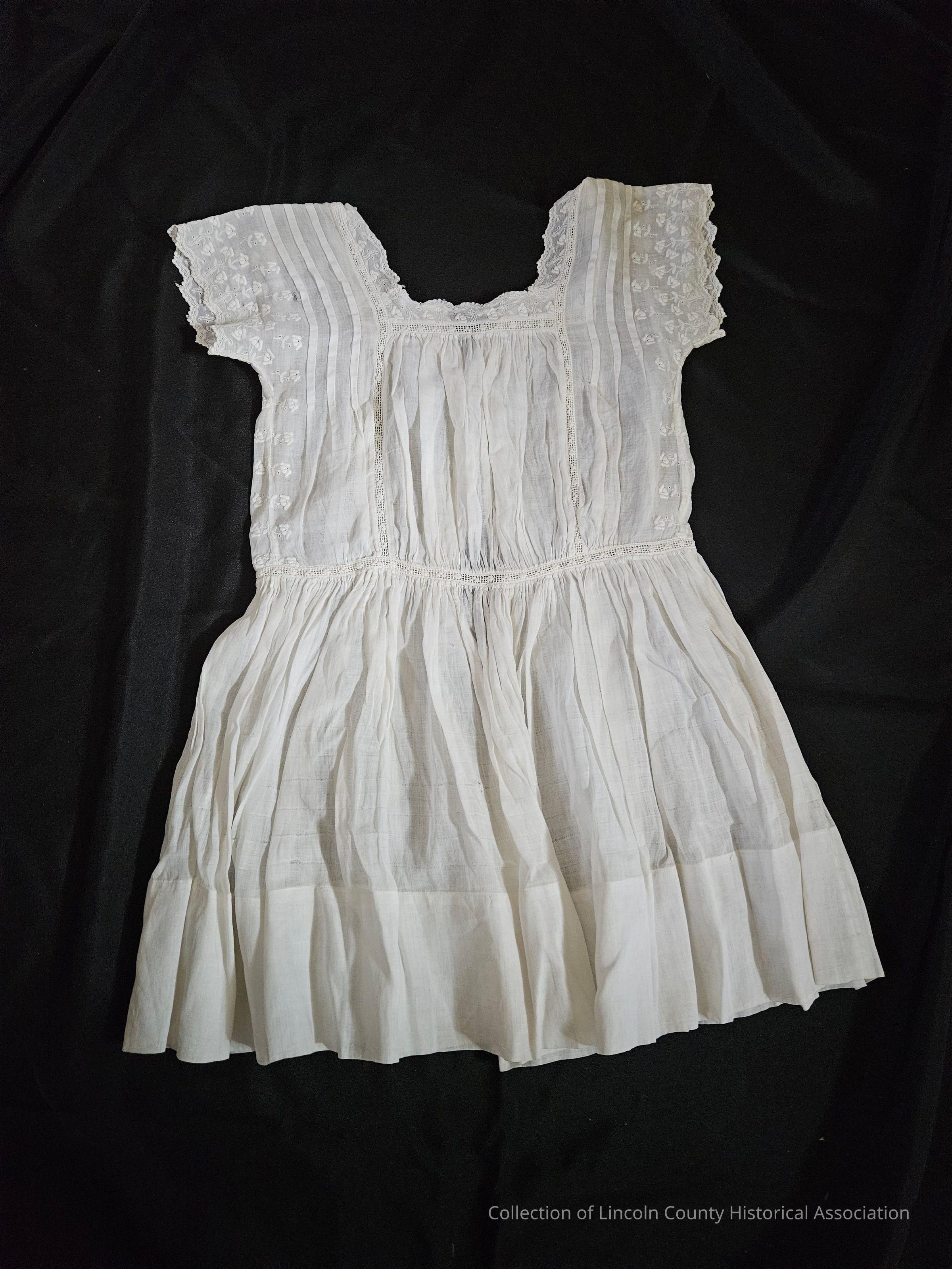 White child's dress. Short sleeve with square neck. Floral embroidery on sleeves, neckline, and sides of dress. Three pleats running over each shoulder. Mesh-like cutout band running around waist and up chest and around neckline. 4 button closure on back.Clothing/Dress/Costume Details