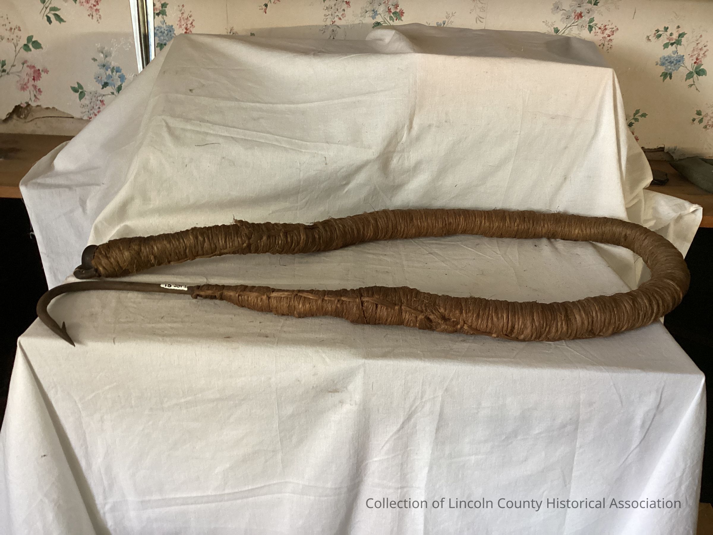 Large barbed iron shark hook attached to a rope with manilla (marline) lashing (sheathing)Made/Created