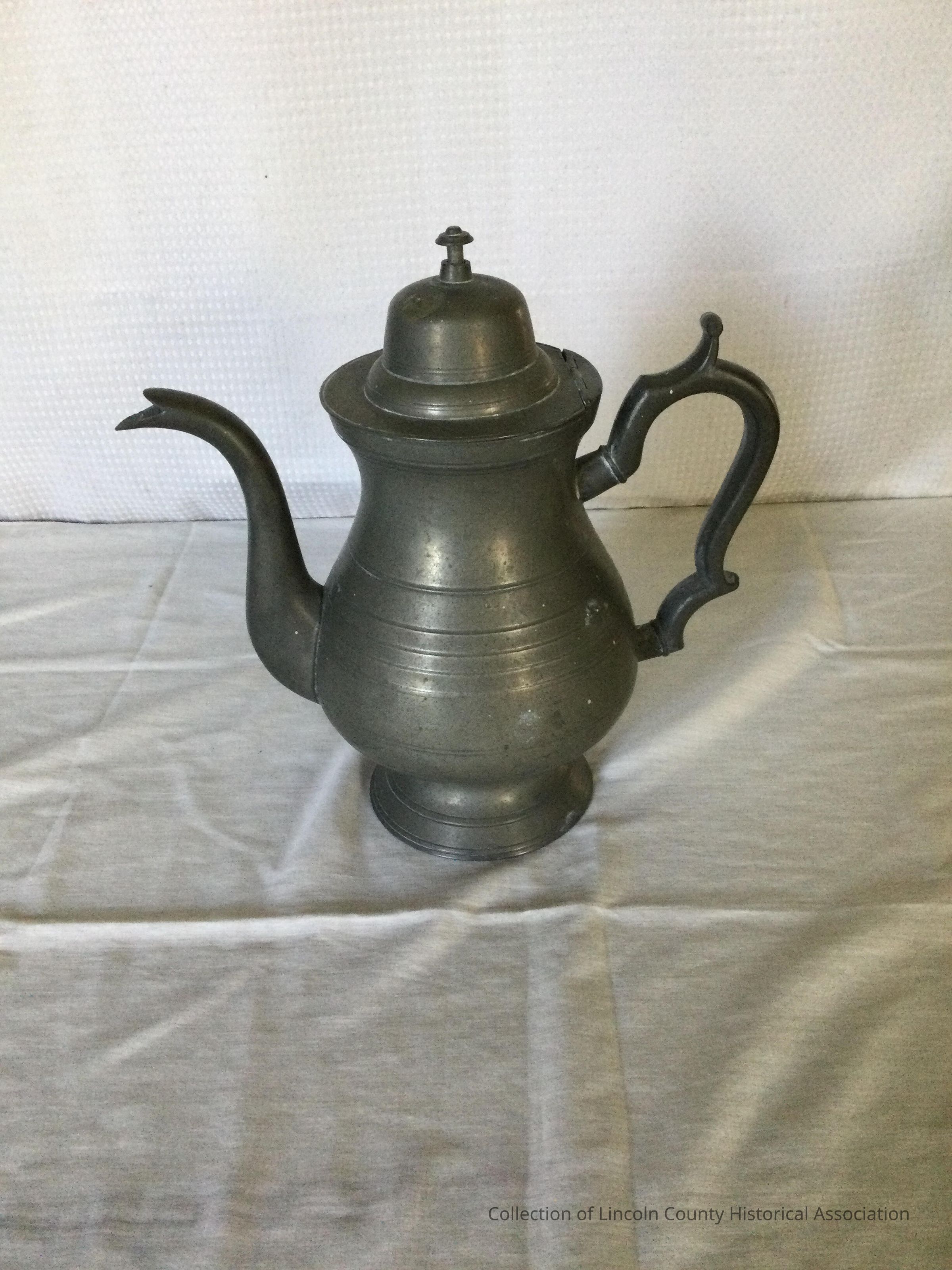 Pewter coffee pot on a round base. Bell-shaped cap with knob finial, and with a crook stack handle and spoutMade/Created