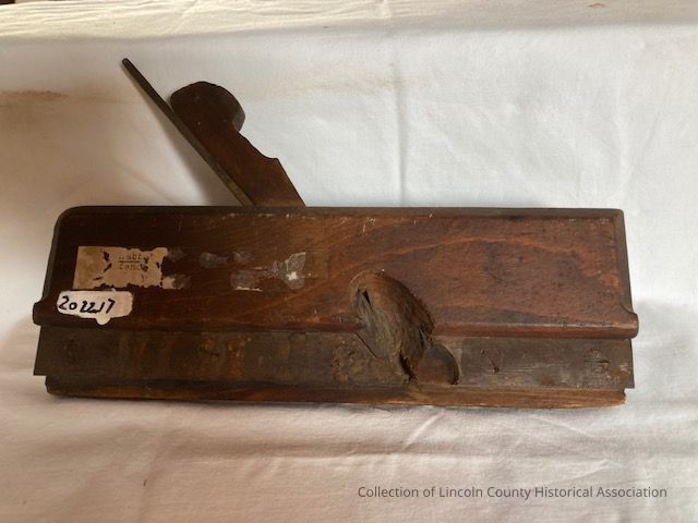 Wooden with a black iron with steel-tipped blade, also with iron wear plate that extends across entire length of plane but is in two posts