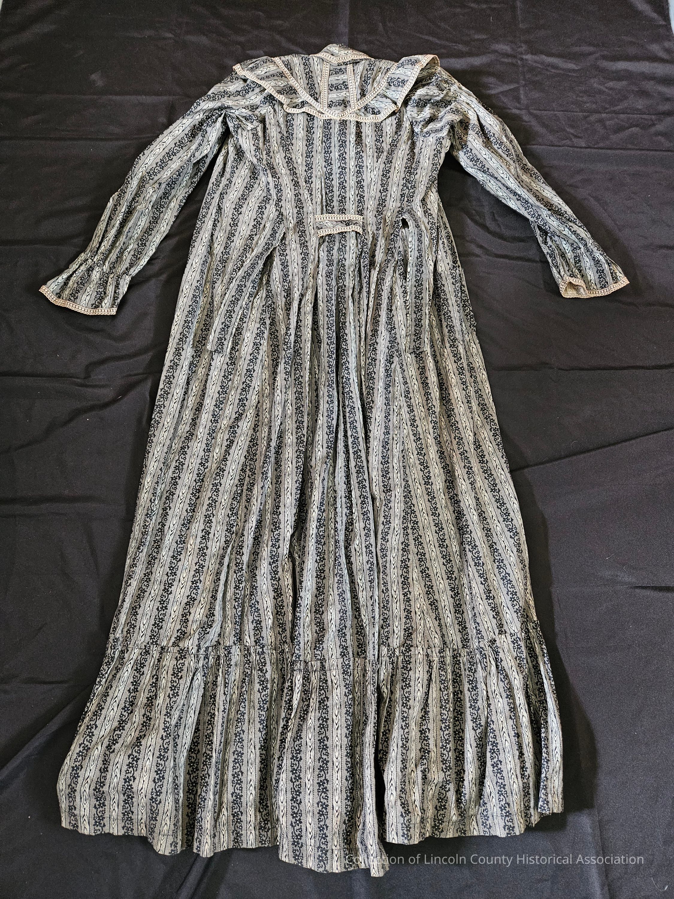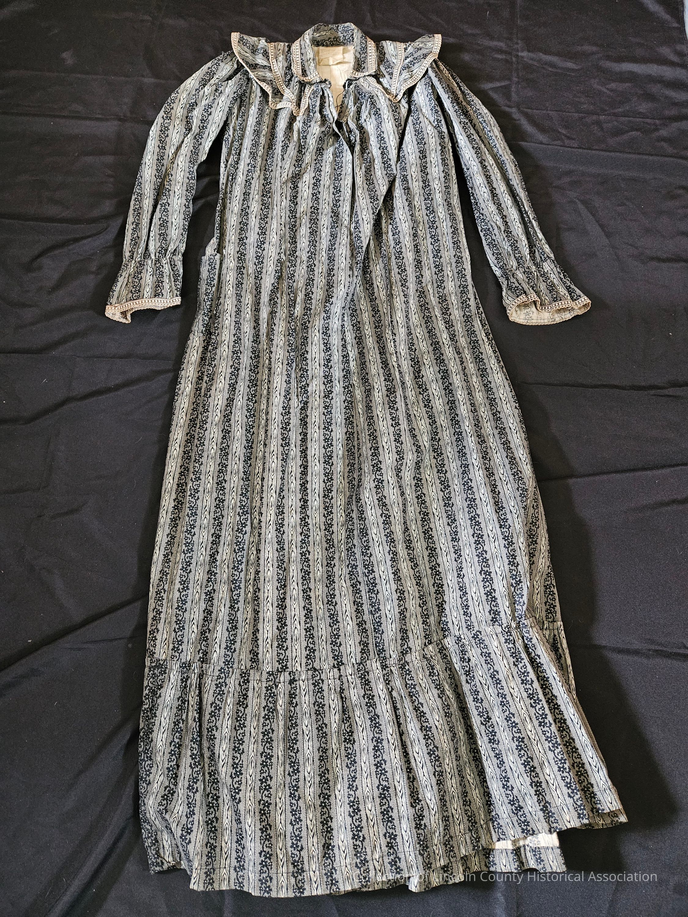 Gray and white wrapper dress. Gray stripes have dark floral pattern on them. Ruffled shoulders and gathered at wrists. Fold over collar. Button closure. One pocket on the side and a strap the same pattern as the rest of the dress around the waist. Commercially made by Freedman Bros.Clothing/Dress/Costume Details