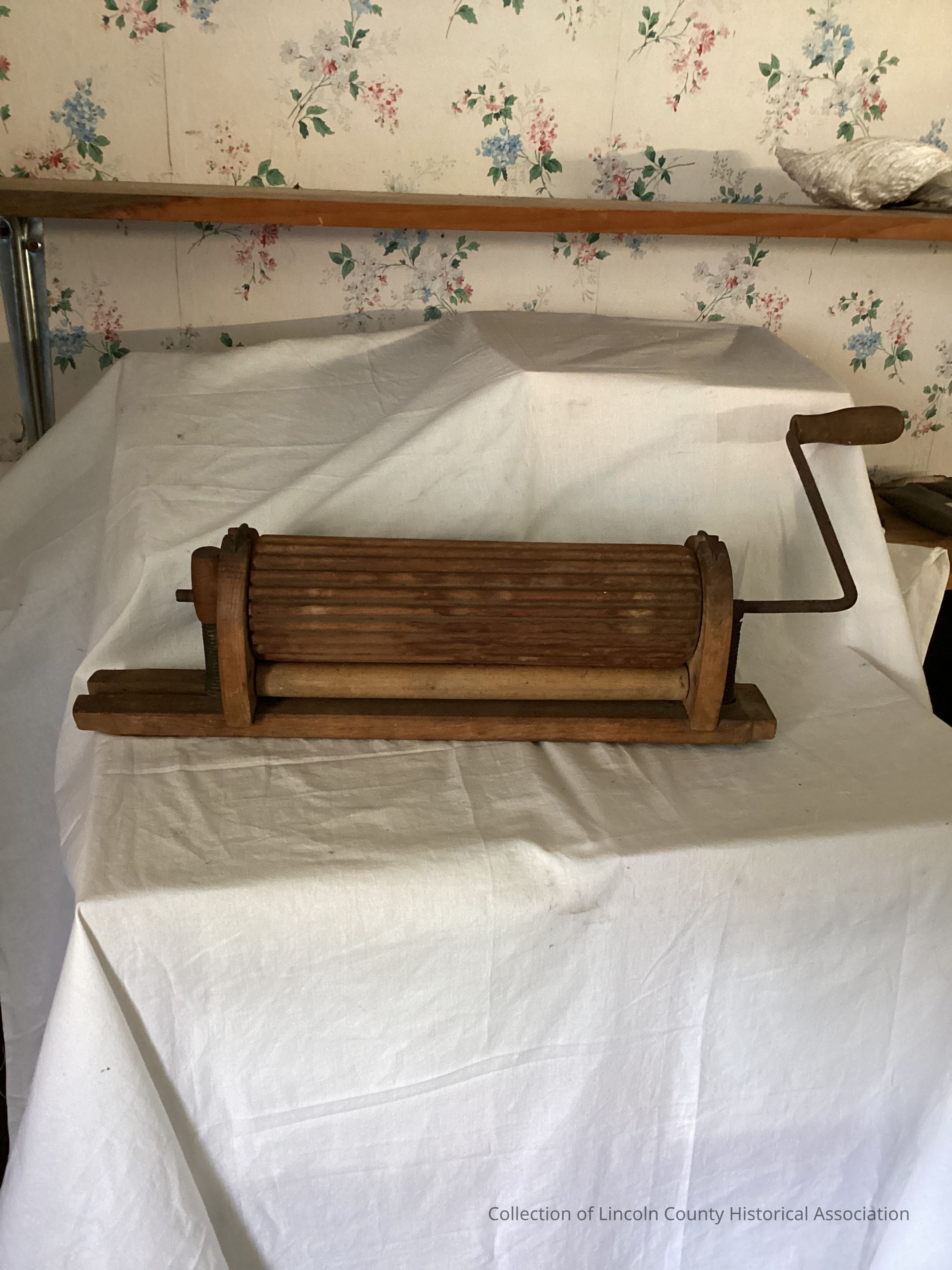 Wooden mangle (wringer) with a metal crank and wooden handle and with two springs. Platform containing three small smooth wringers above which is a larger wooden corrugated wringer.Made/Created