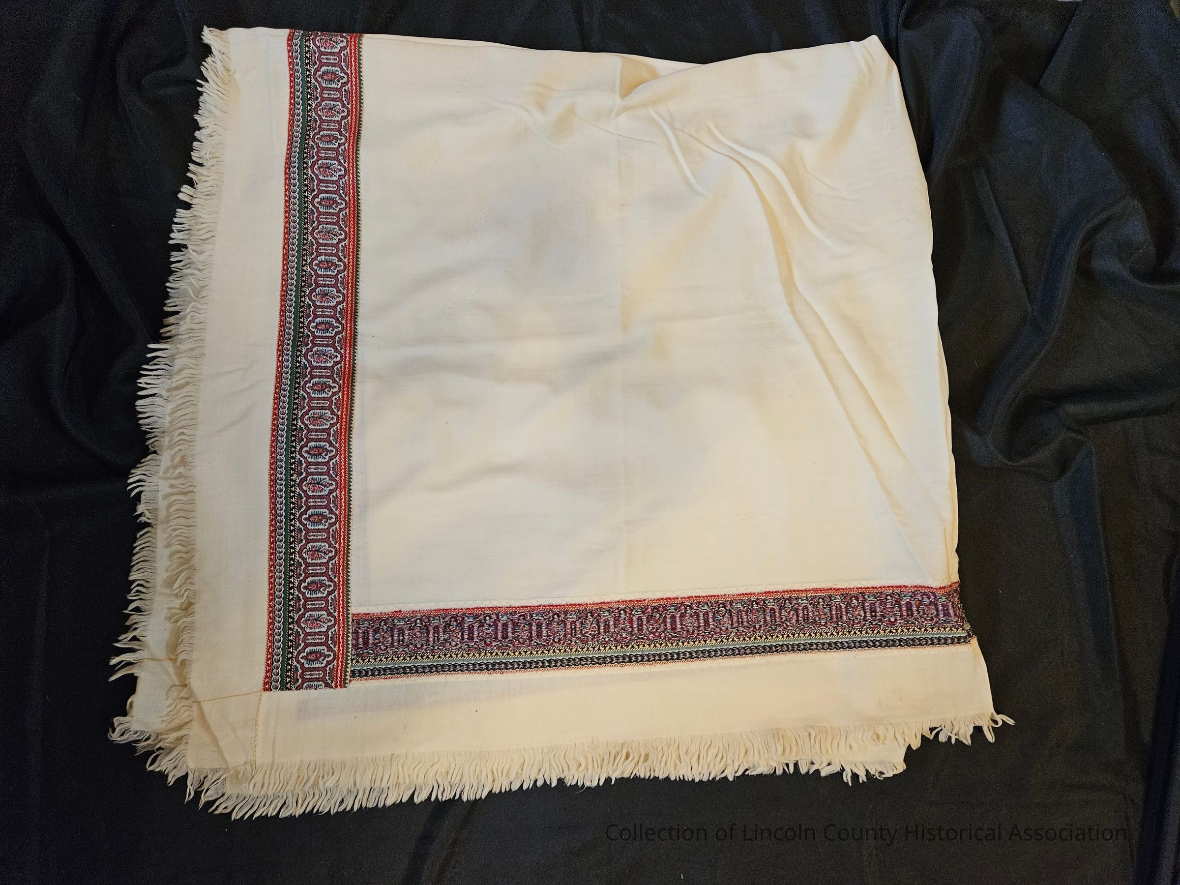 White wool paisley shawl with woven polychrome band around the border. Fringe on all four sides. Square in shape.Clothing/Dress/Costume Details
