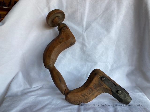 Beech wood bit brace (also known as a bitstock). With rabbited sides and a turned hand grip elbow. Has a cast iron ferule for a squared chuck or bit. Also has a brass chuck. The revolving buttons in these braces were examples of fine woodworking. They were "stayed" by either a cotter pin at its base or by a wooden pin through the hardwood shaft.Made/Created