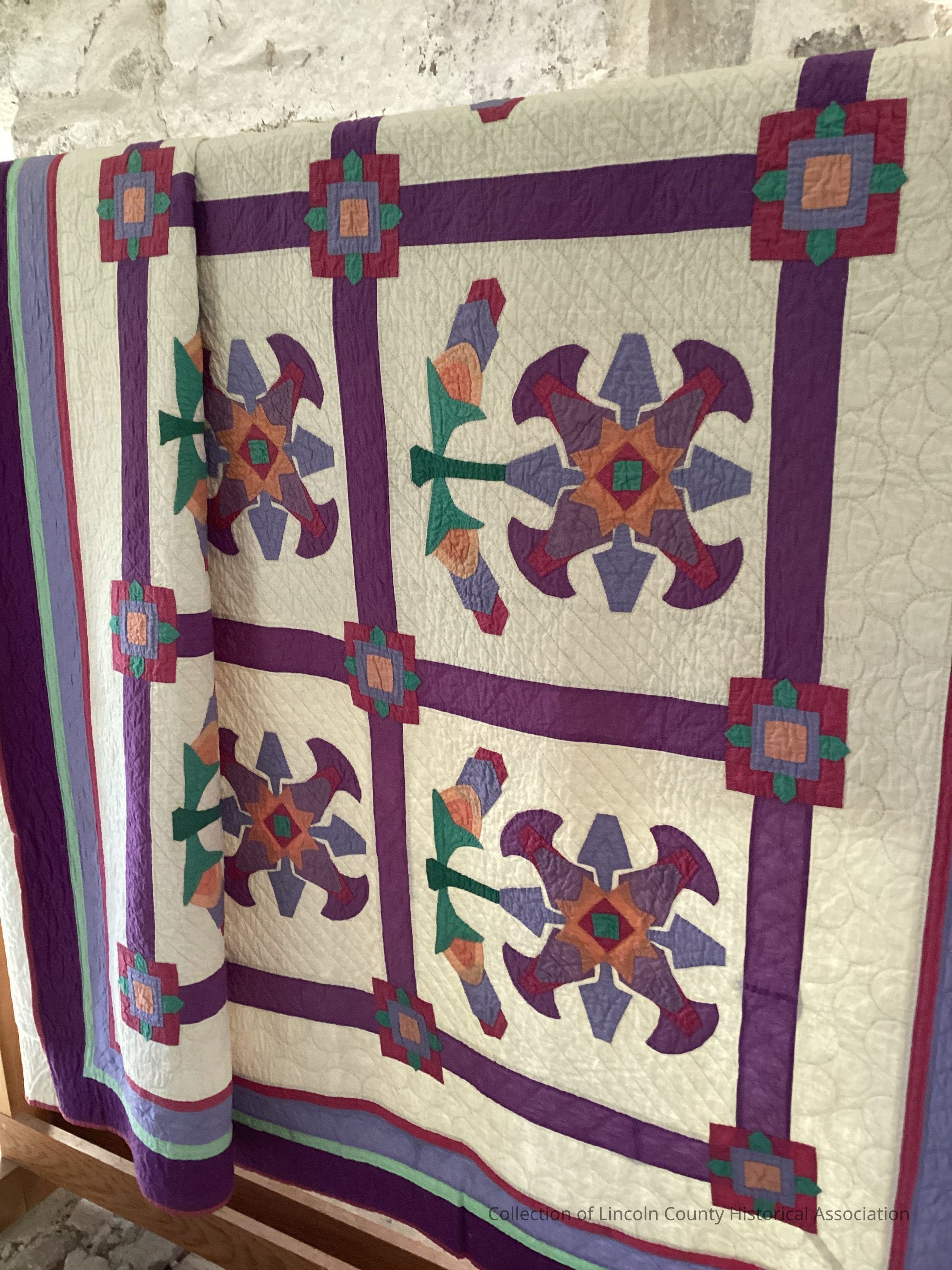 Applique patchwork quilt. Off white purple, mauve, bluish-red, 2 shades of green and orange. Bands of purple and bluish-red framing a design comprised of twelve squares, each square containing a multicolor stylized flower.Made/Created