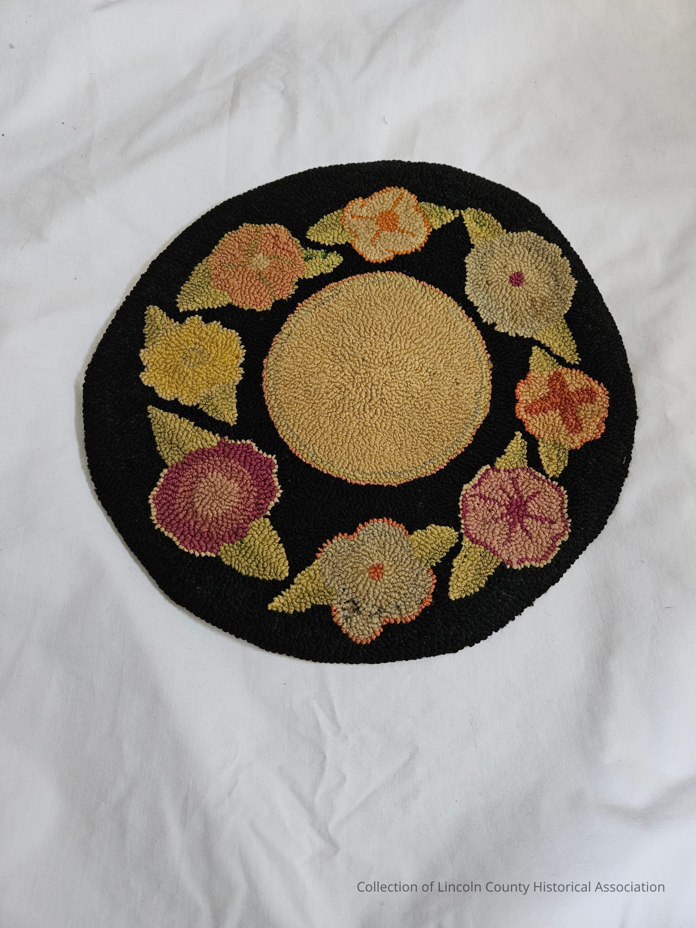 Small decorative hooked rug/mat. Circular in shape with beige circle in center surrounded by flowers inset in black.Made/Created