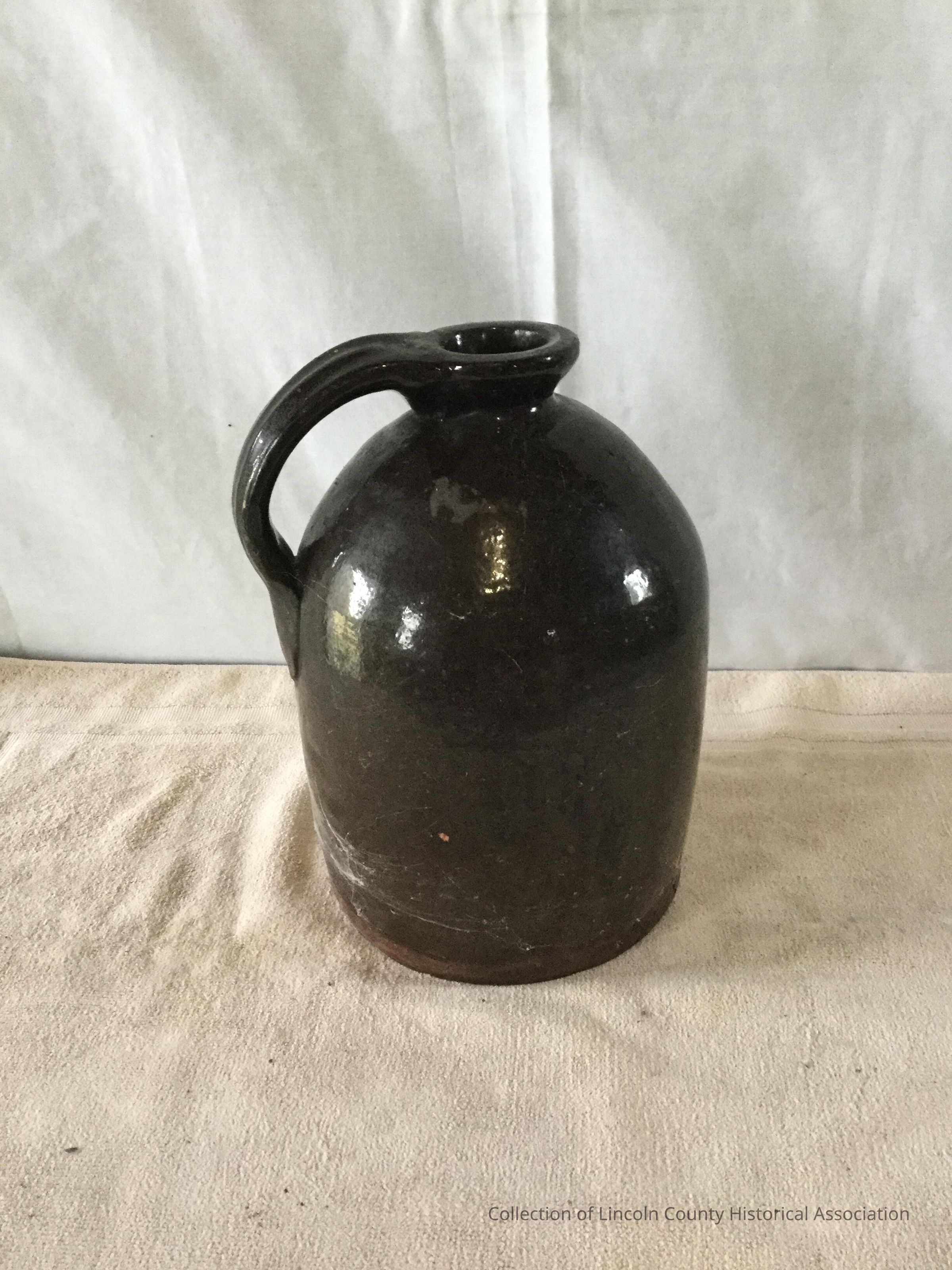 Cylindrical jug with a single handle with a dark brown slip glaze